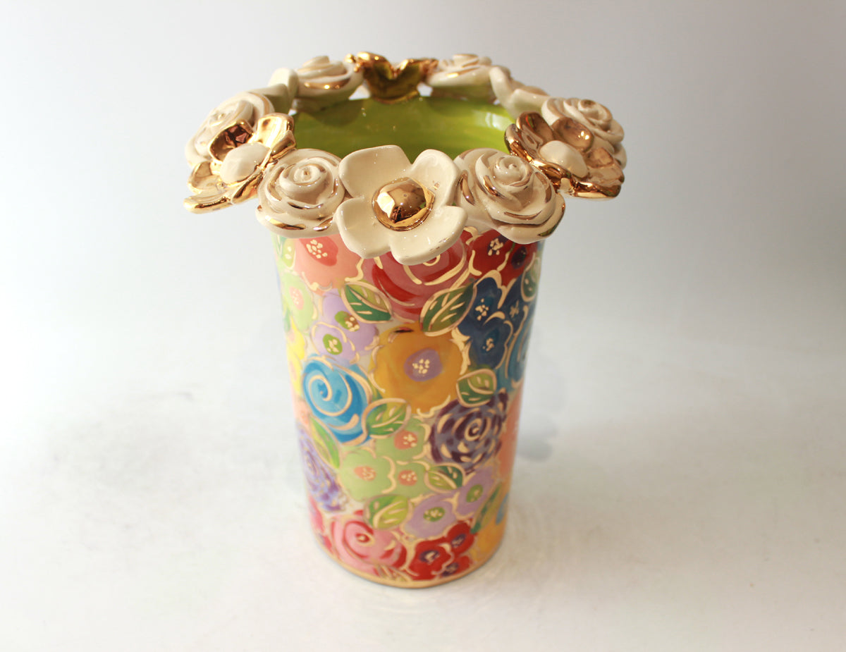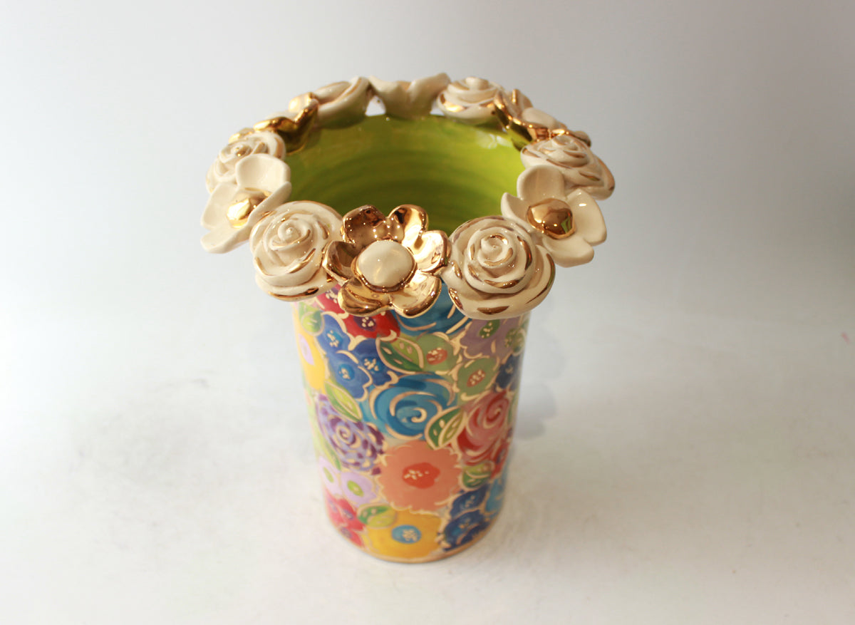 Mary Rose's Cylinder Vases look much different than her other creations, standing around 8 inches in height what they lack in curves they certainly make up for in style! This one is painted in "Pastel Blooms", where colourful bouquets are broken only by accents of 24 carat gold...the Vase also features a ring of ceramic flowers around its rim, which have also unsurprisingly been adorned with gold...