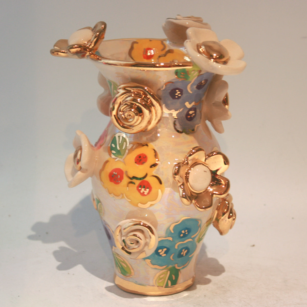 A Small Vase made by Mary Rose stands around 7 inches tall, and this one is rather special as it has gold and white flowers studded all over the outside. The design is Petit Fleur, with accents of 24 carat gold....