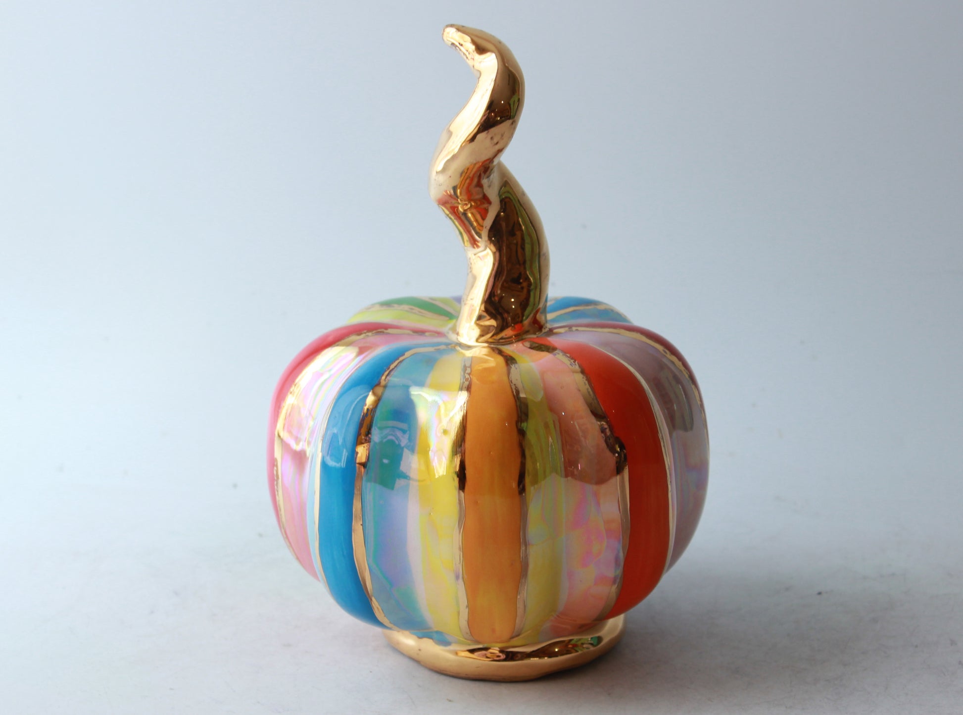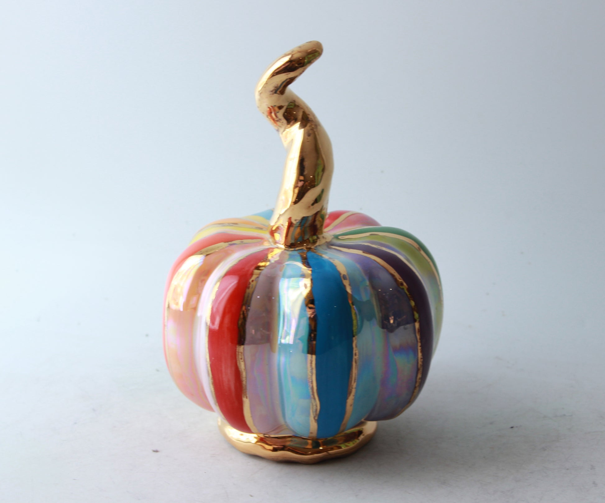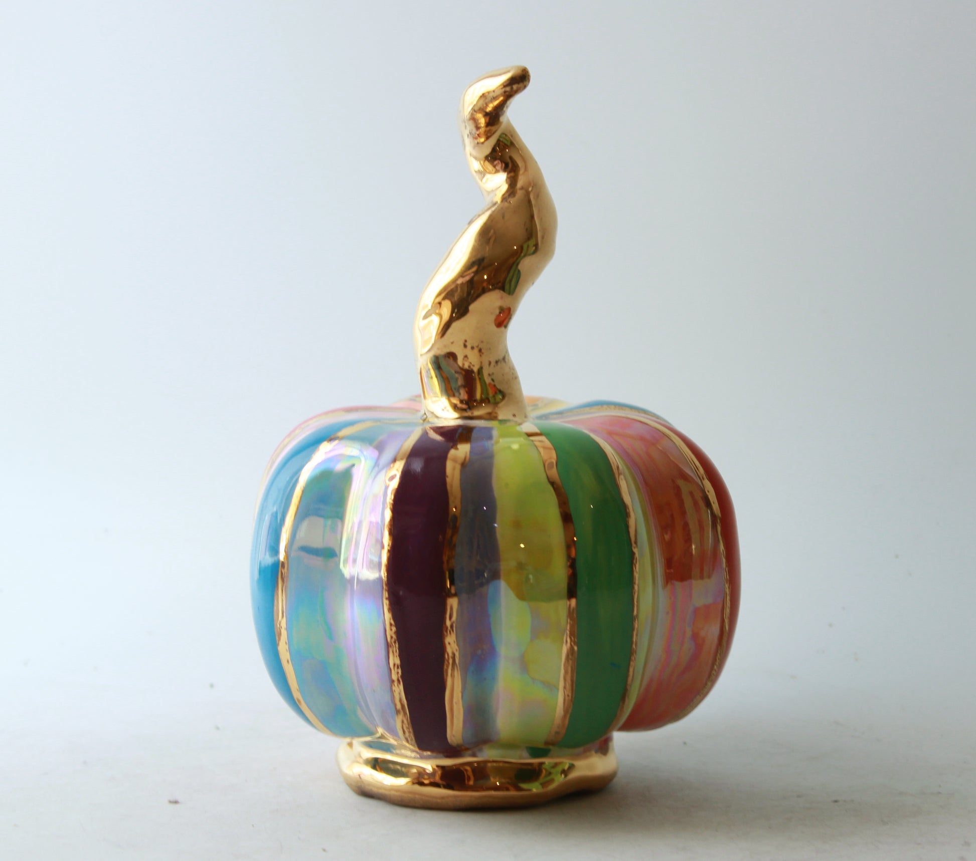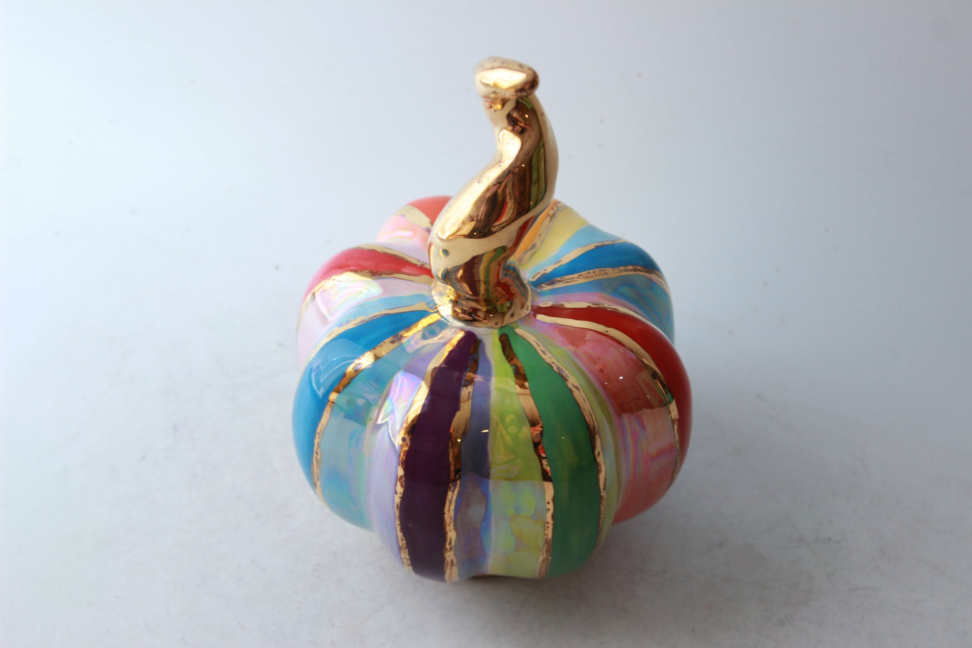 Mary Rose's Pumpkin body is made in a mould and then she fashions a stem to suit and fits it on. On this piece the pumpkin's idiosyncratic shape is enhanced by vertical lustred stripes. As you can see the pumpkin body is only just over 3 inches high but the stem takes it up to over 6 inches overall