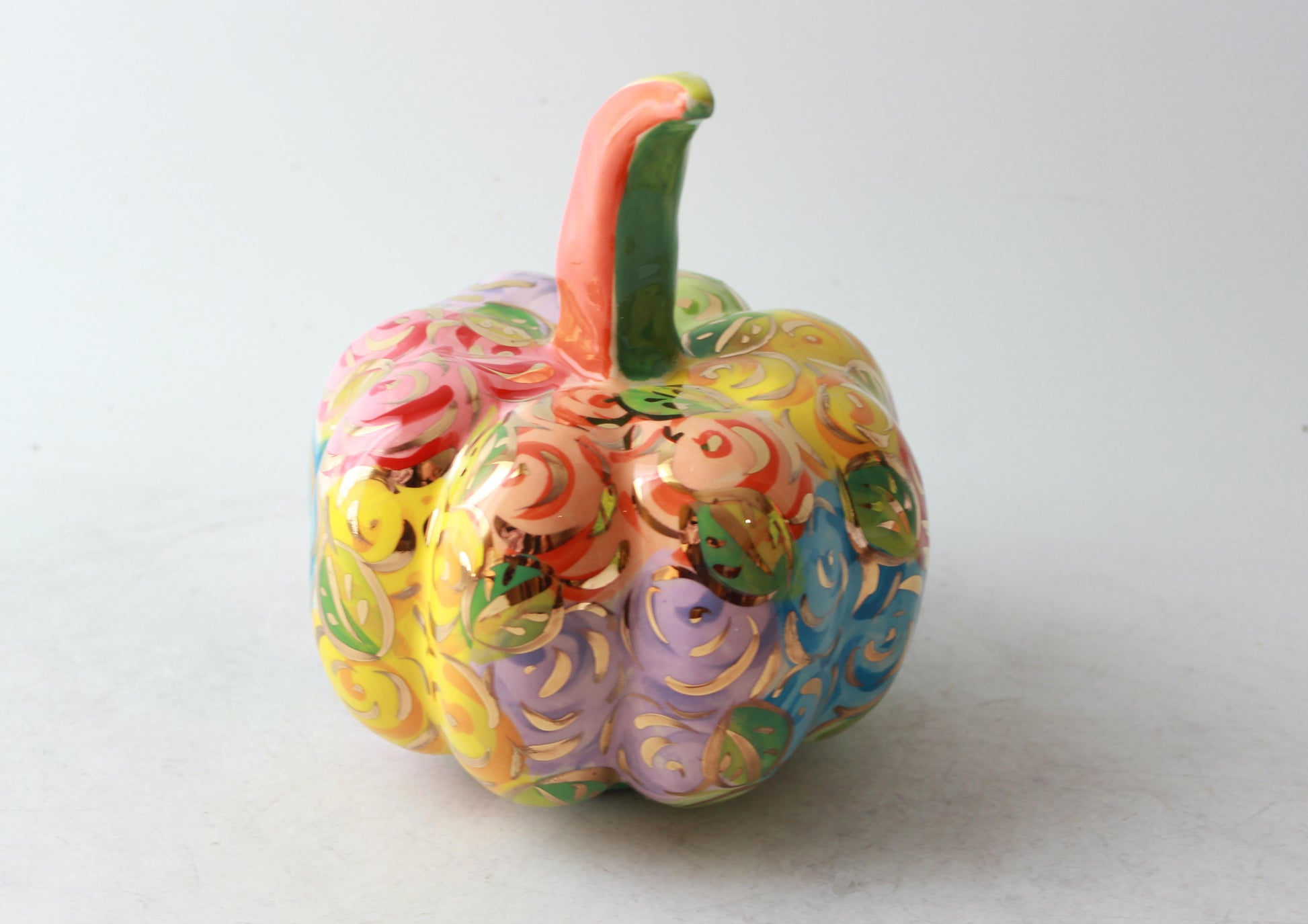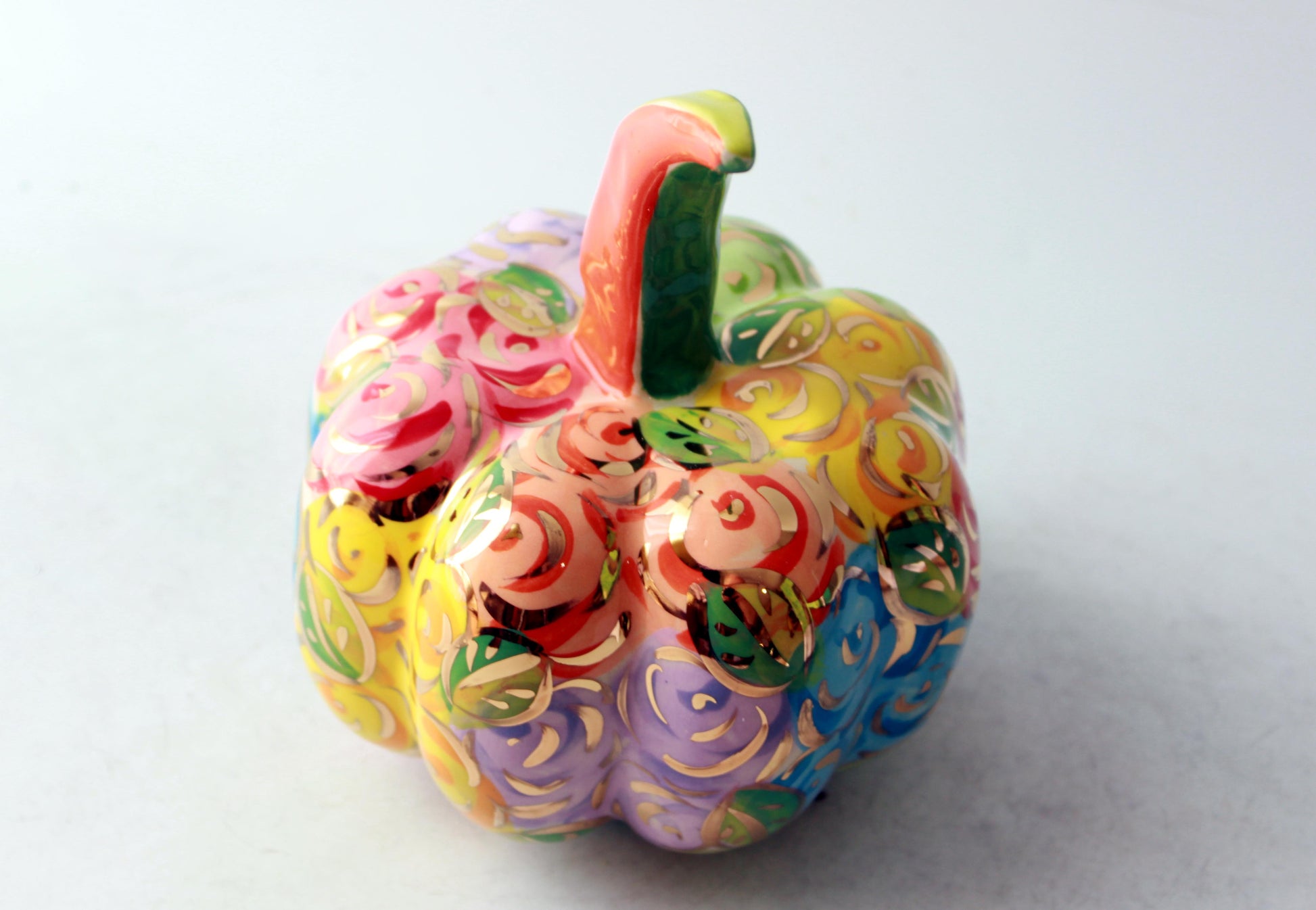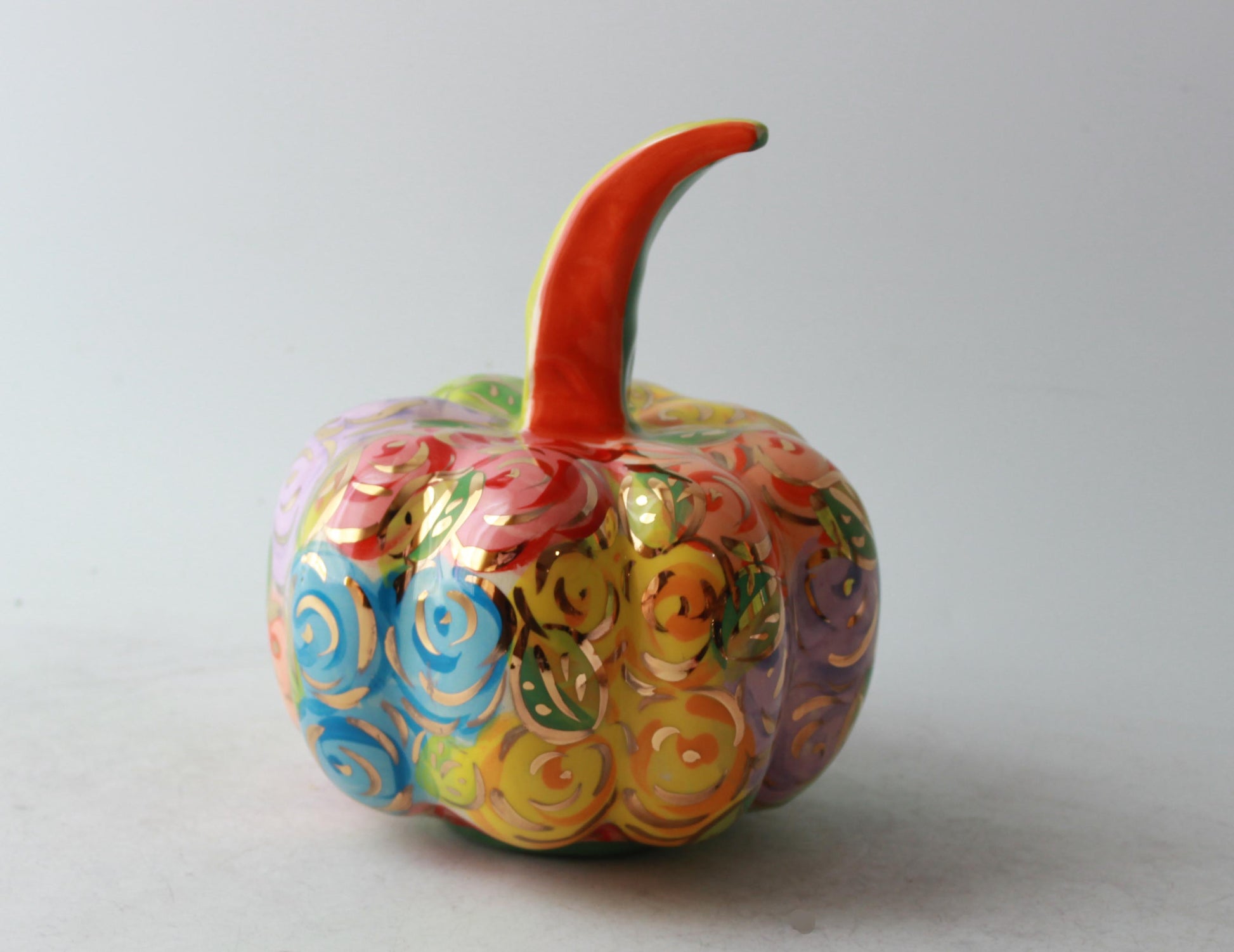 Mary Rose Small Pumpkin is about 5½ inches high and 5 in diameter...she makes the familiar bulgeing body in a mould and then fashions a fantasy stem out of clay before attaching it at the top. This model is in a multicoloured Rosebush design and has a three coloured stem
