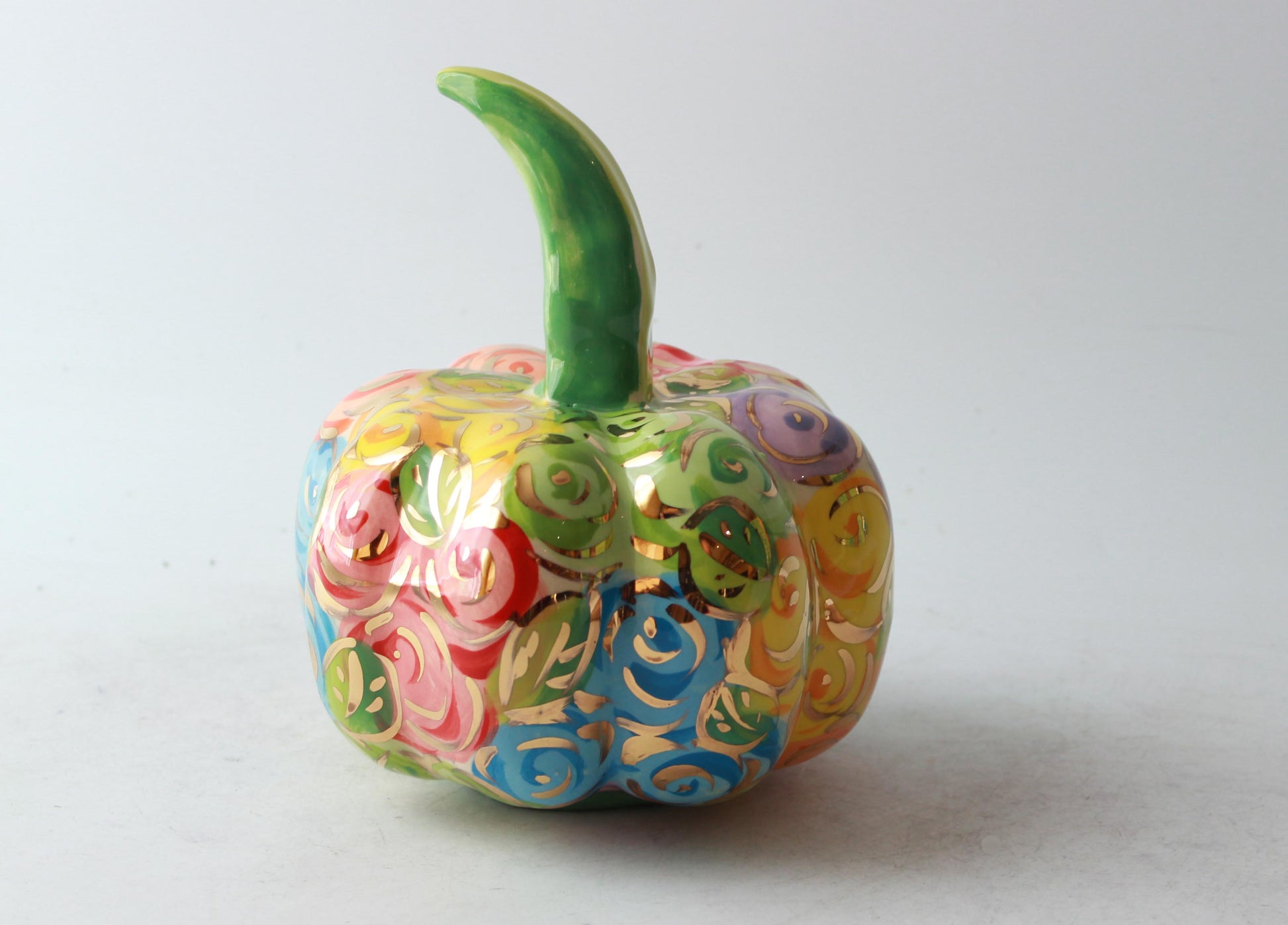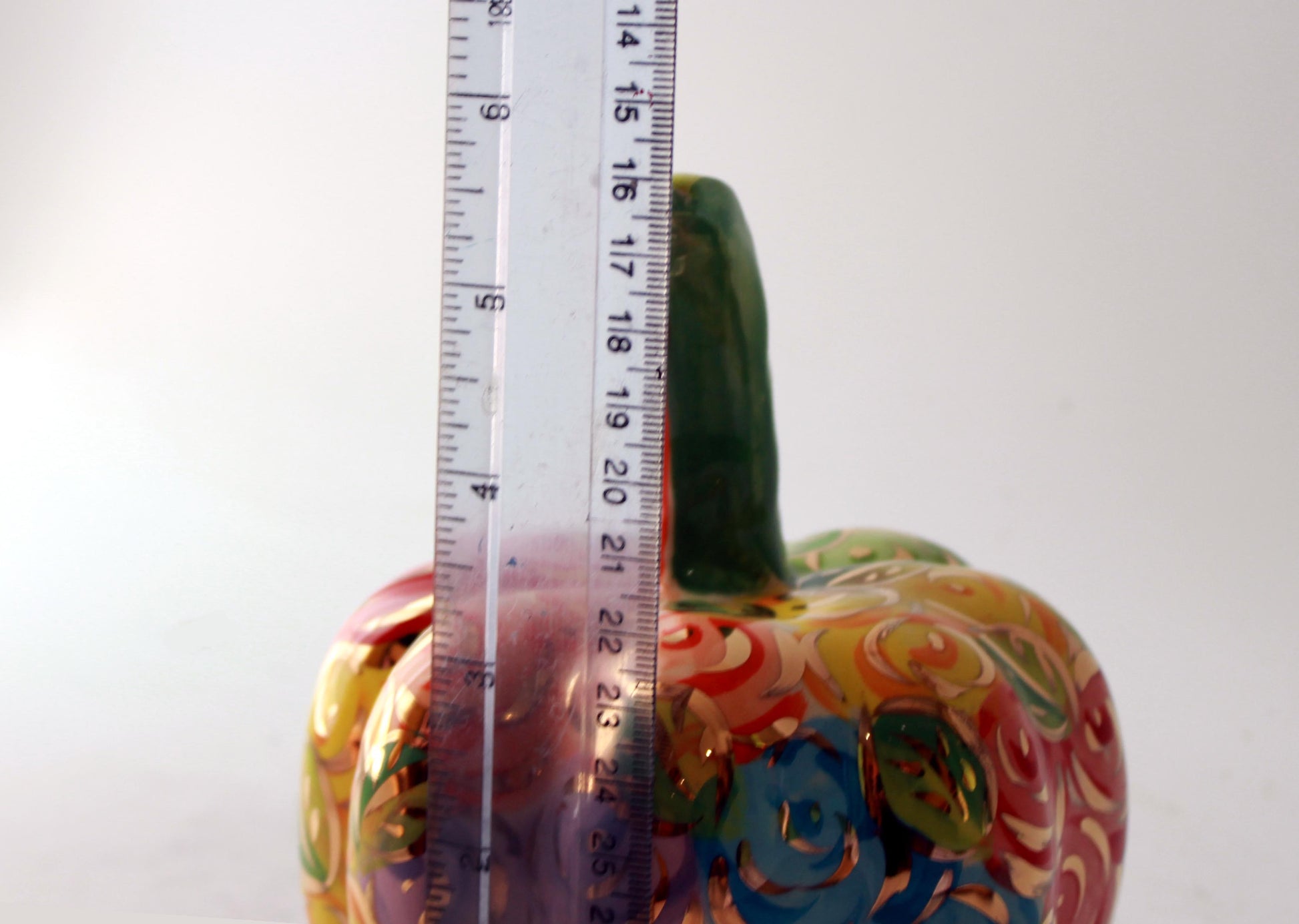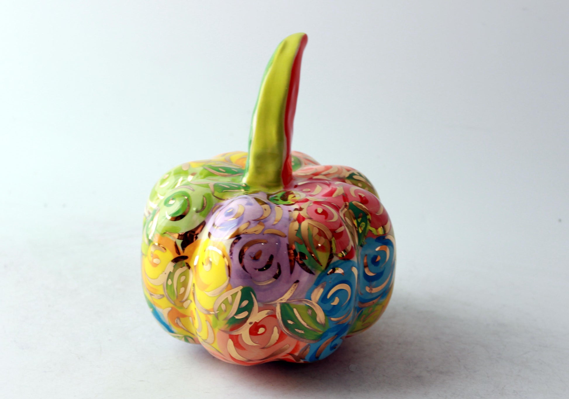 Mary Rose Small Pumpkin is about 5½ inches high and 5 in diameter...she makes the familiar bulgeing body in a mould and then fashions a fantasy stem out of clay before attaching it at the top. This model is in a multicoloured Rosebush design and has a three coloured stem