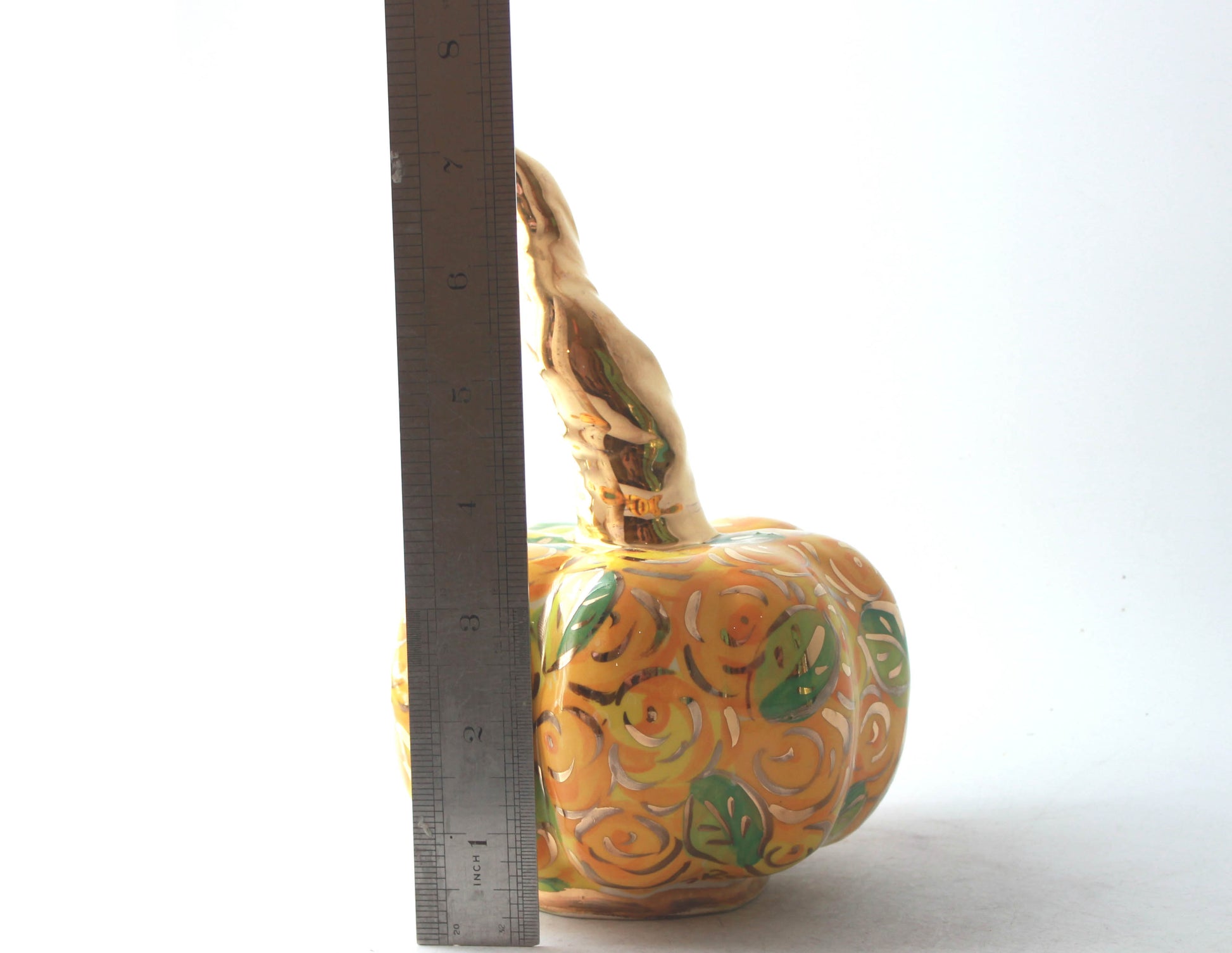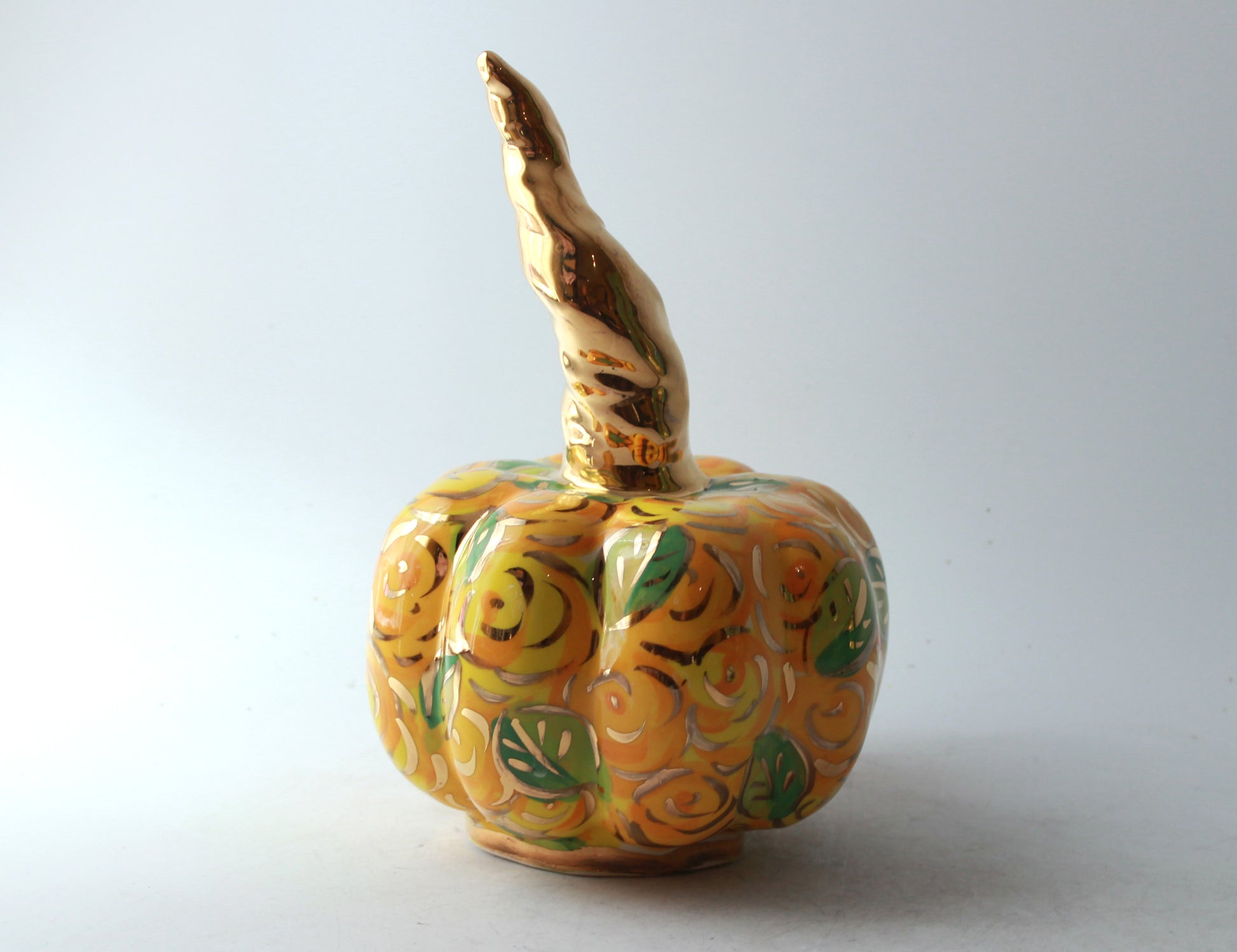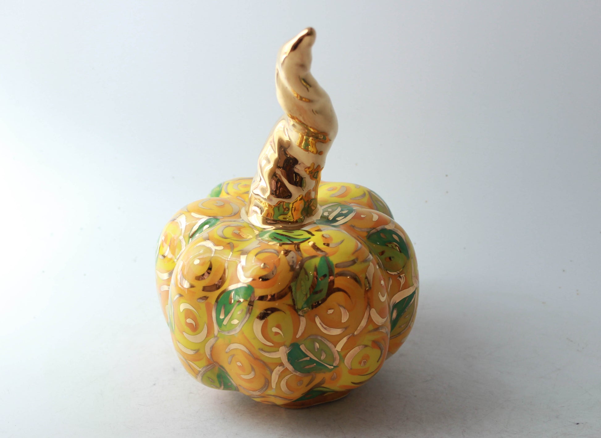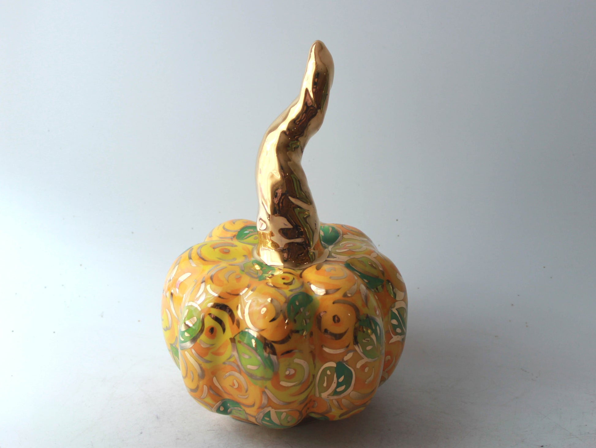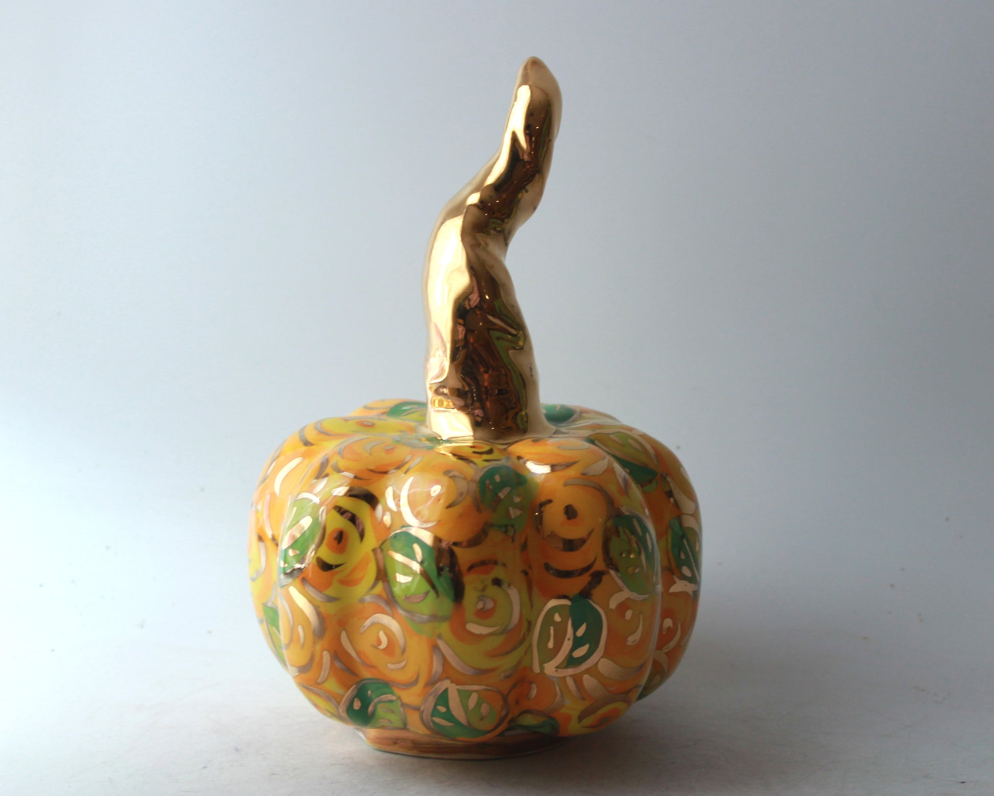 Yellow is not a colour that one would immediately connect with roses, but then Mary Rose doesn't usually employ the colour you expect, and as a colour yellow is bright and fresh. It's also one of the colours that an autumn leaf will go through and thus perhaps perfect for Halloween. This pumpkin is about 7 inches high.