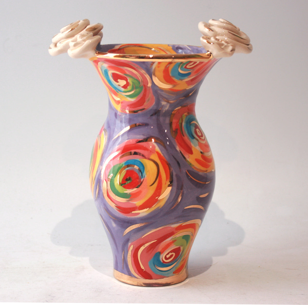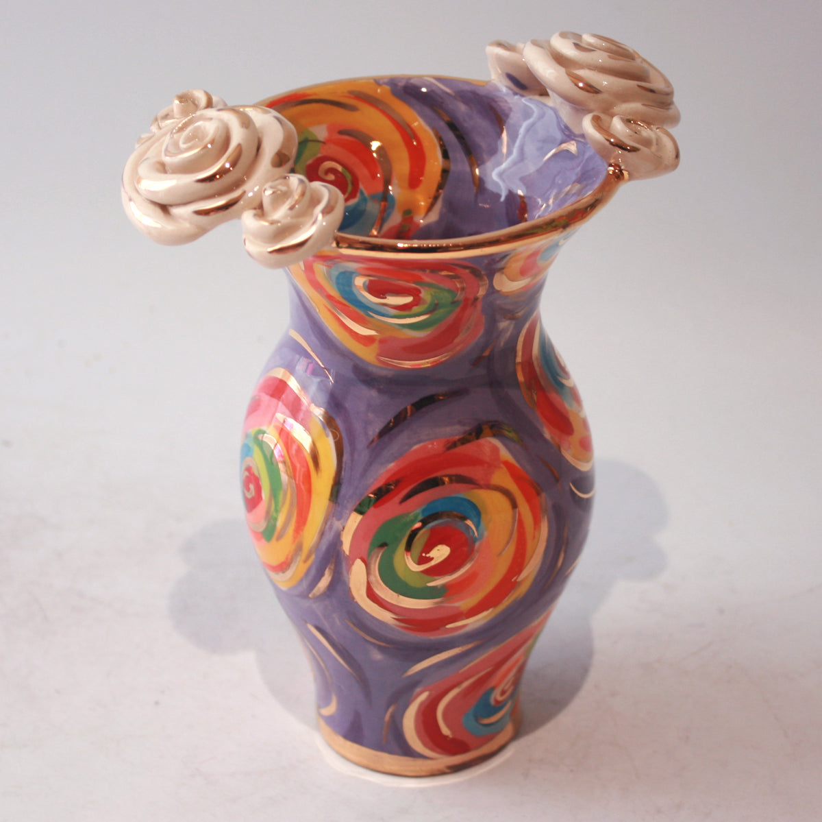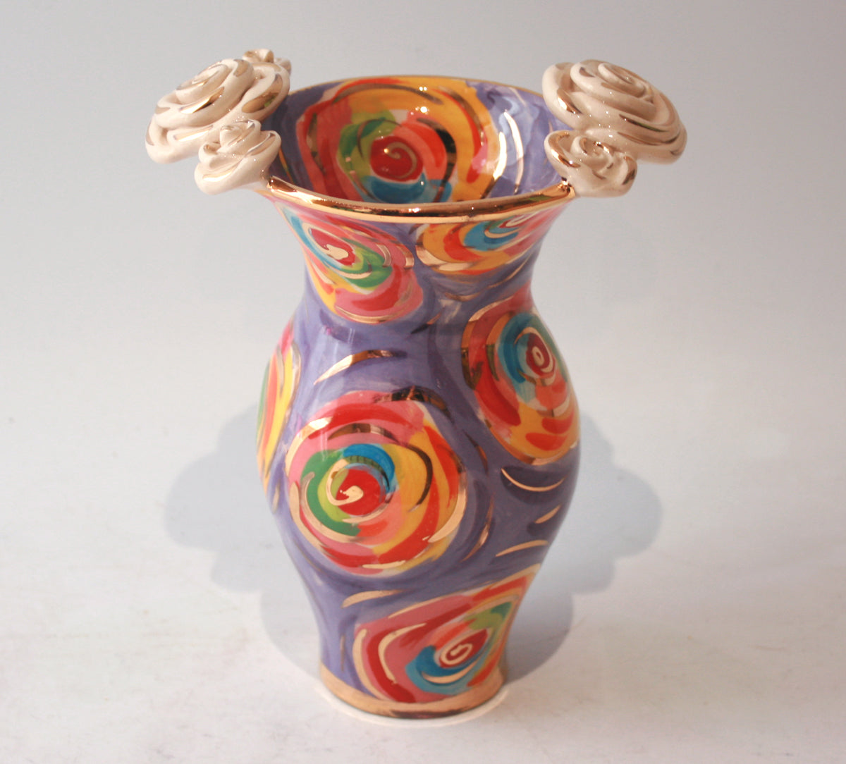 Mary Rose's Small Vases stand around 7 inches tall...this one is painted in a Purple variation upon the classic "Swirls" design, and features two white gold roses on either side of its rim...