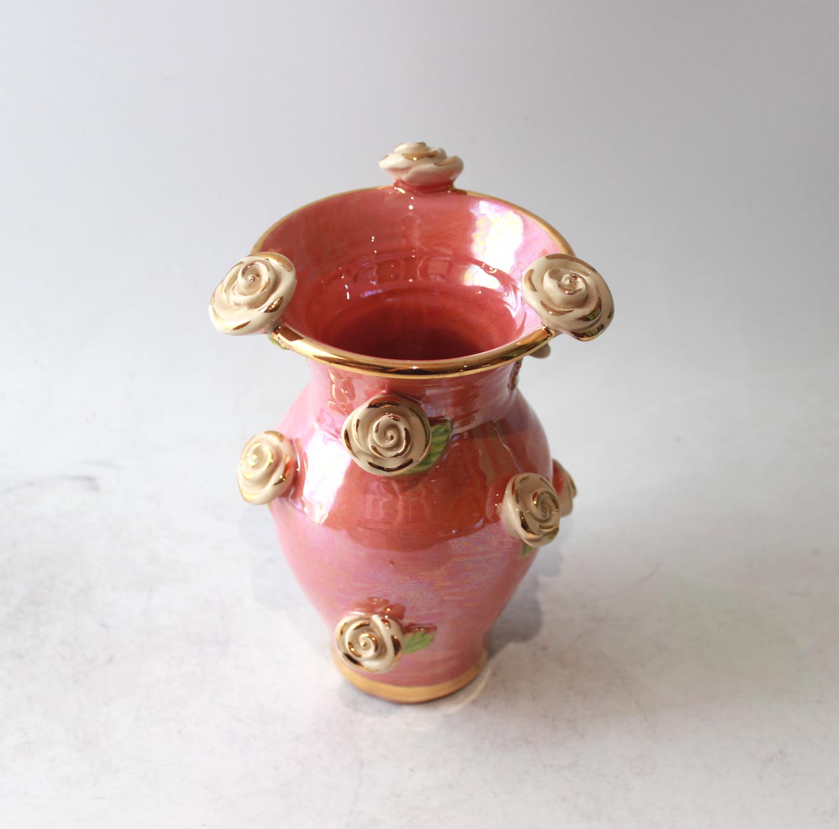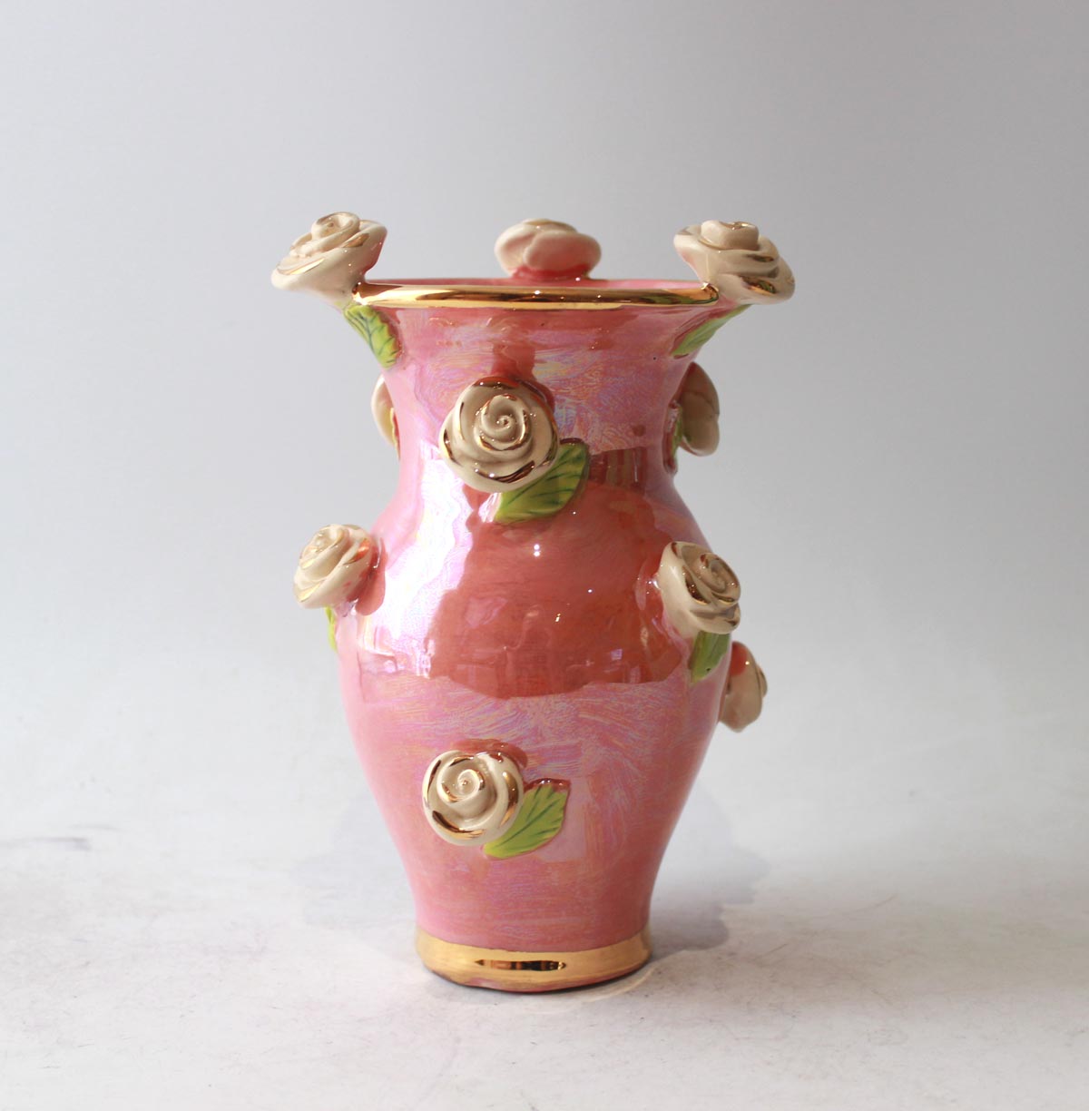 A Small Vase made by Mary Rose stands around 7 inches in height, and this one has been studded with many ceramic white gold roses all over its surface! It is painted in the prettiest pink with a layer of mother of pearl, and will certainly make heads turn wherever it is put...