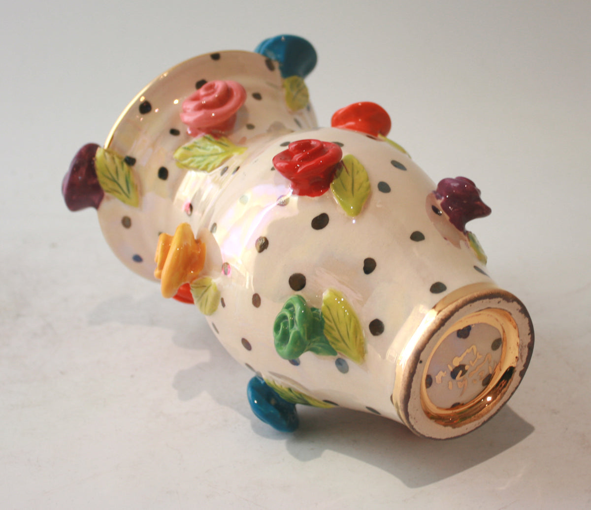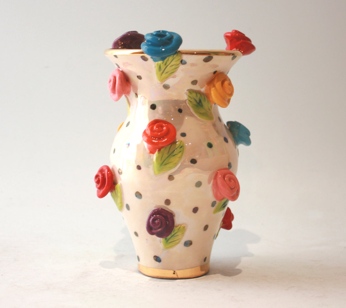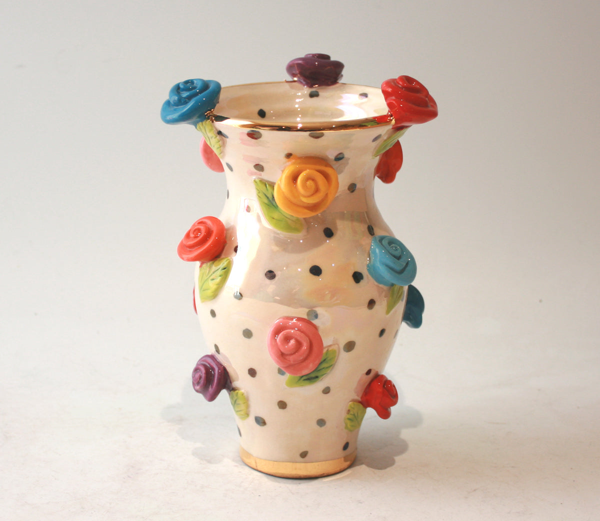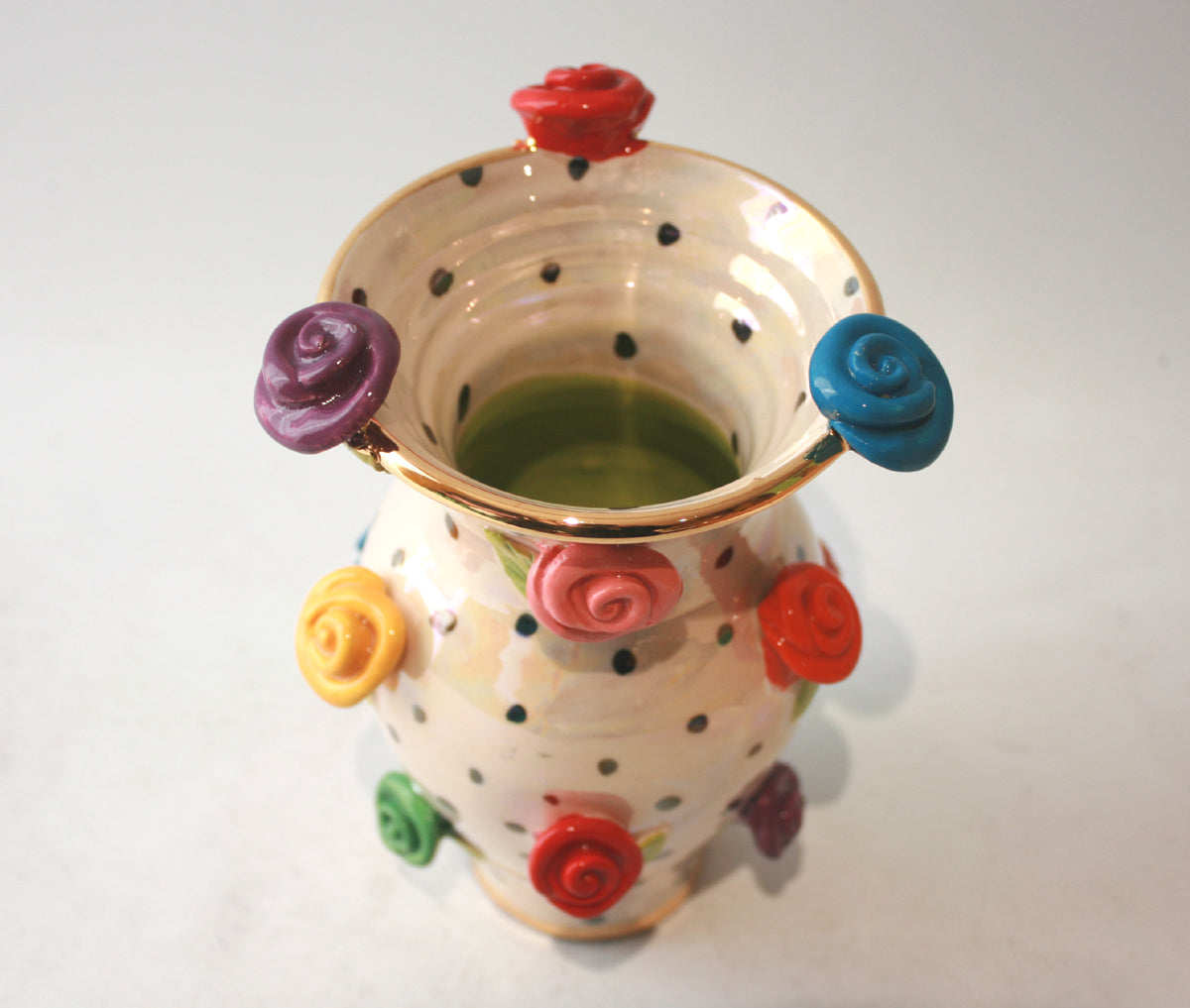 A Small Vase made by Mary Rose stands just under 7 inches high, and this one has multicoloured ceramic roses stuck all over its surface...the design is "Polka Dots" on an iridescent background with a gold rim and base to tie it all together...