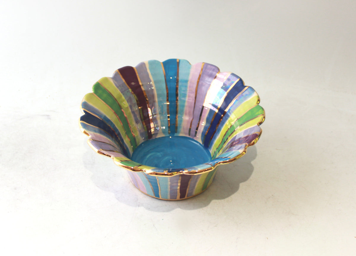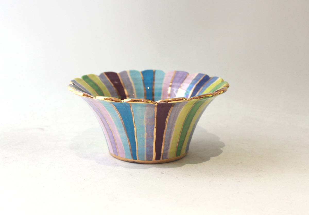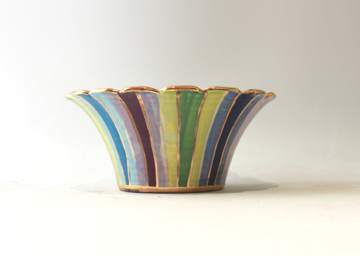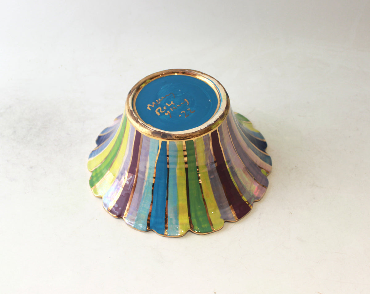 Mary Rose's Small Serving Bowls measure around 8 inches in diameter and are full of all of the whimsical charm which defines her work...this one is painted in "Lustred Stripe" design, where colourful stripes are broken by strokes of 24 carat gold! The edge has also been "Fluted", to give the most eye-catching effect...