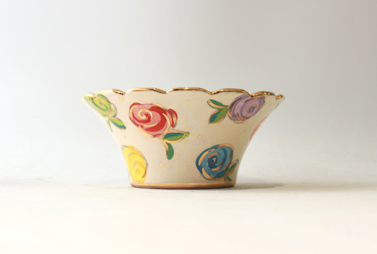 Mary Rose's Small Serving Bowls measure around 8 inches in diameter and are full of all of the whimsical joy which defines her work...this one is painted in "Rosebud", a design where various brightly coloured roses sit perfectly placed on a shimmering Mother of Pearl background...The edge of the Bowl has also been "Fluted", giving the most magical overall effect!