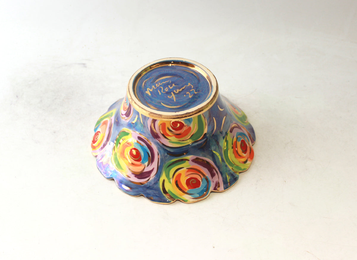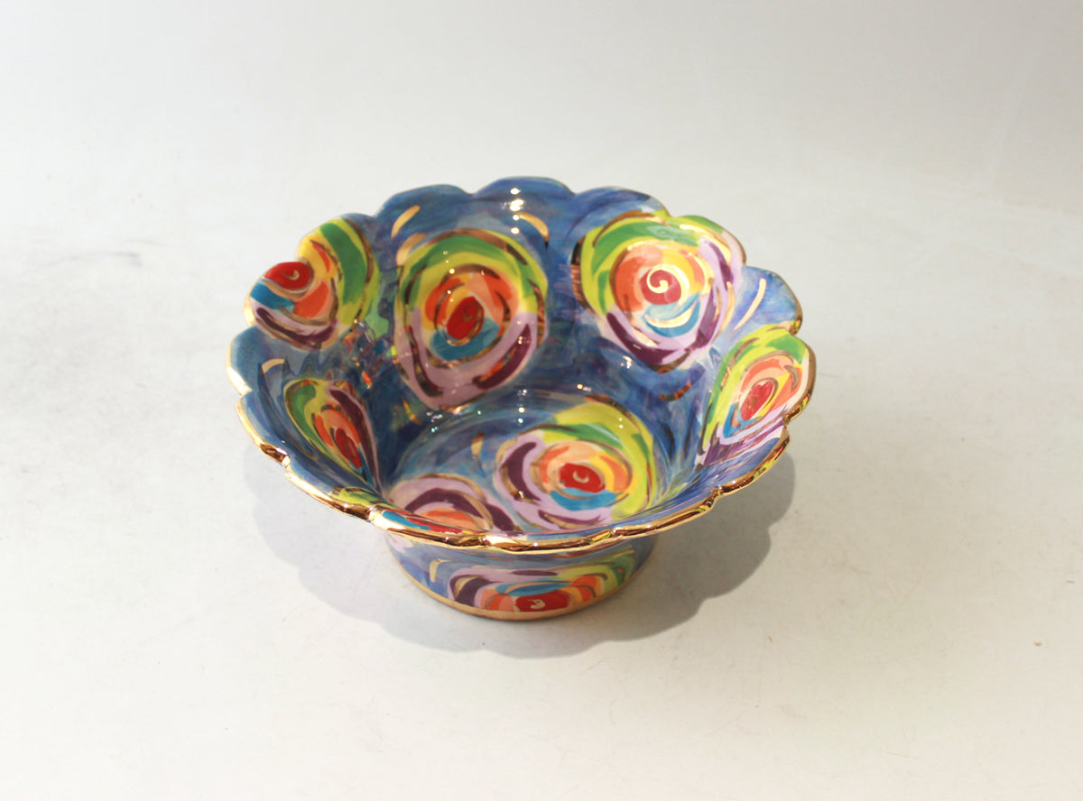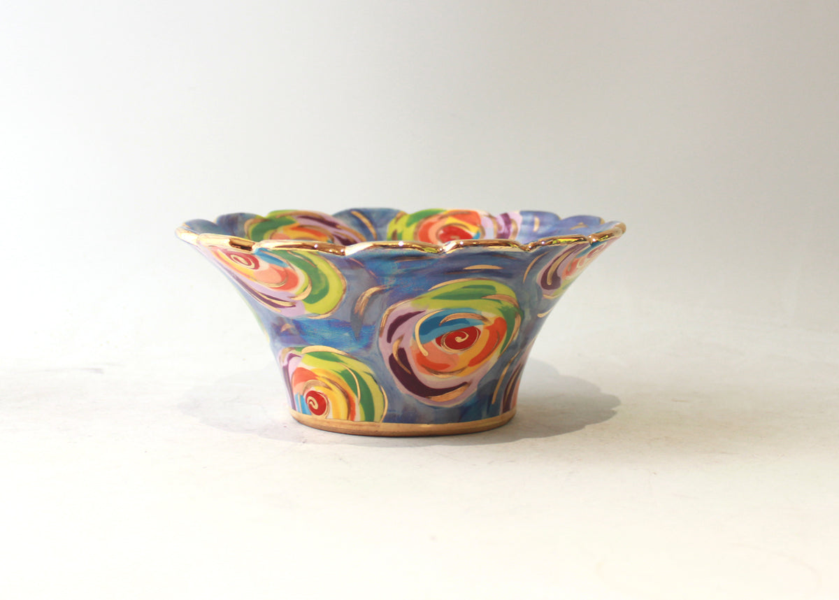 Mary Rose's Small Serving Bowls measure around 8 inches in diameter and are full of all of the whimsical charm which defines her work... this one is painted in "Swirls" design, where colourful roses sit on an iridescent Mother of Pearl background and are flecked with accents of 24 carat gold! The rim of the Bowl has been "Fluted", to give the most eye-catching effect...