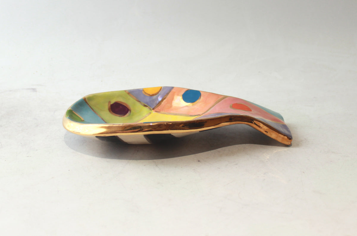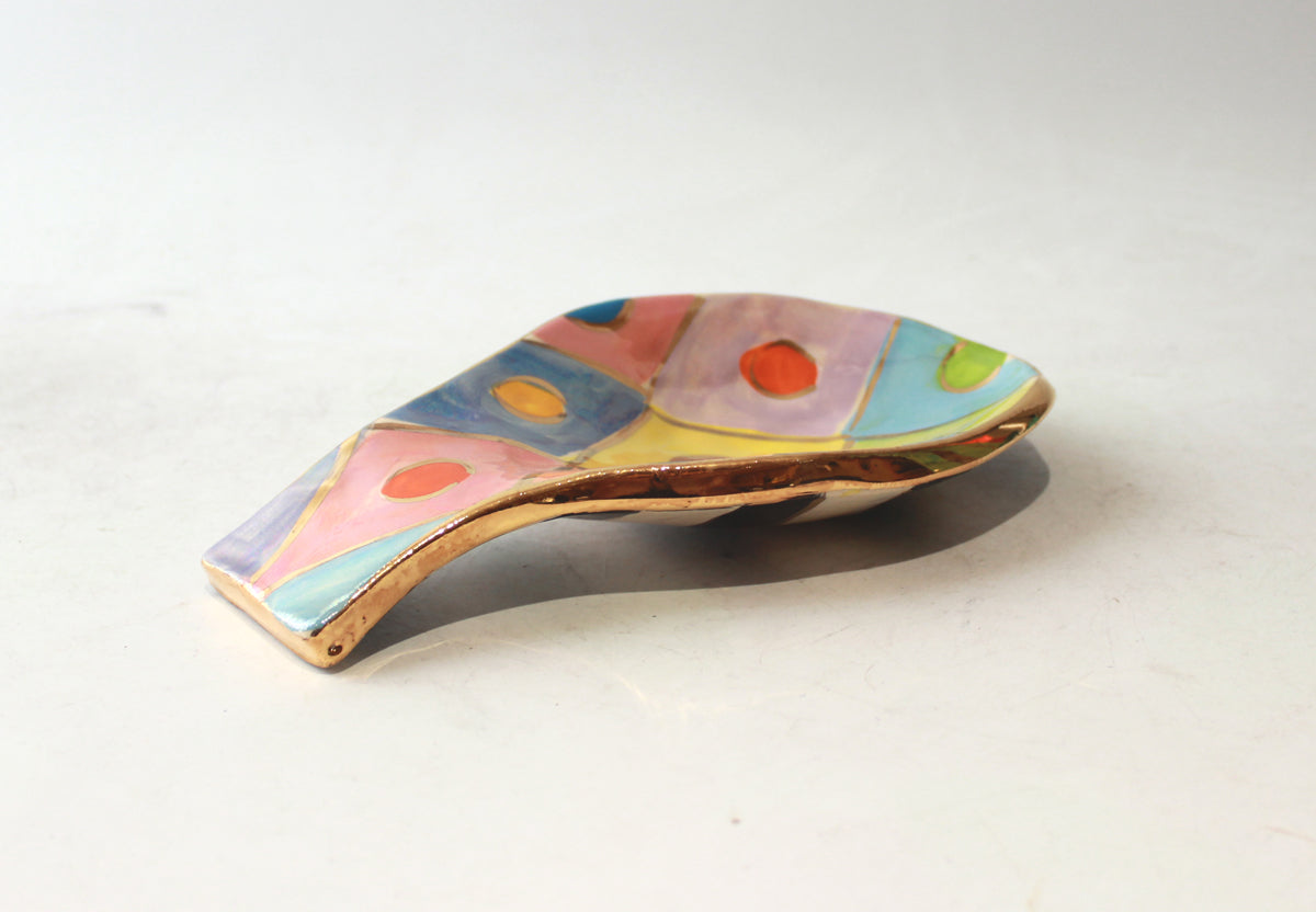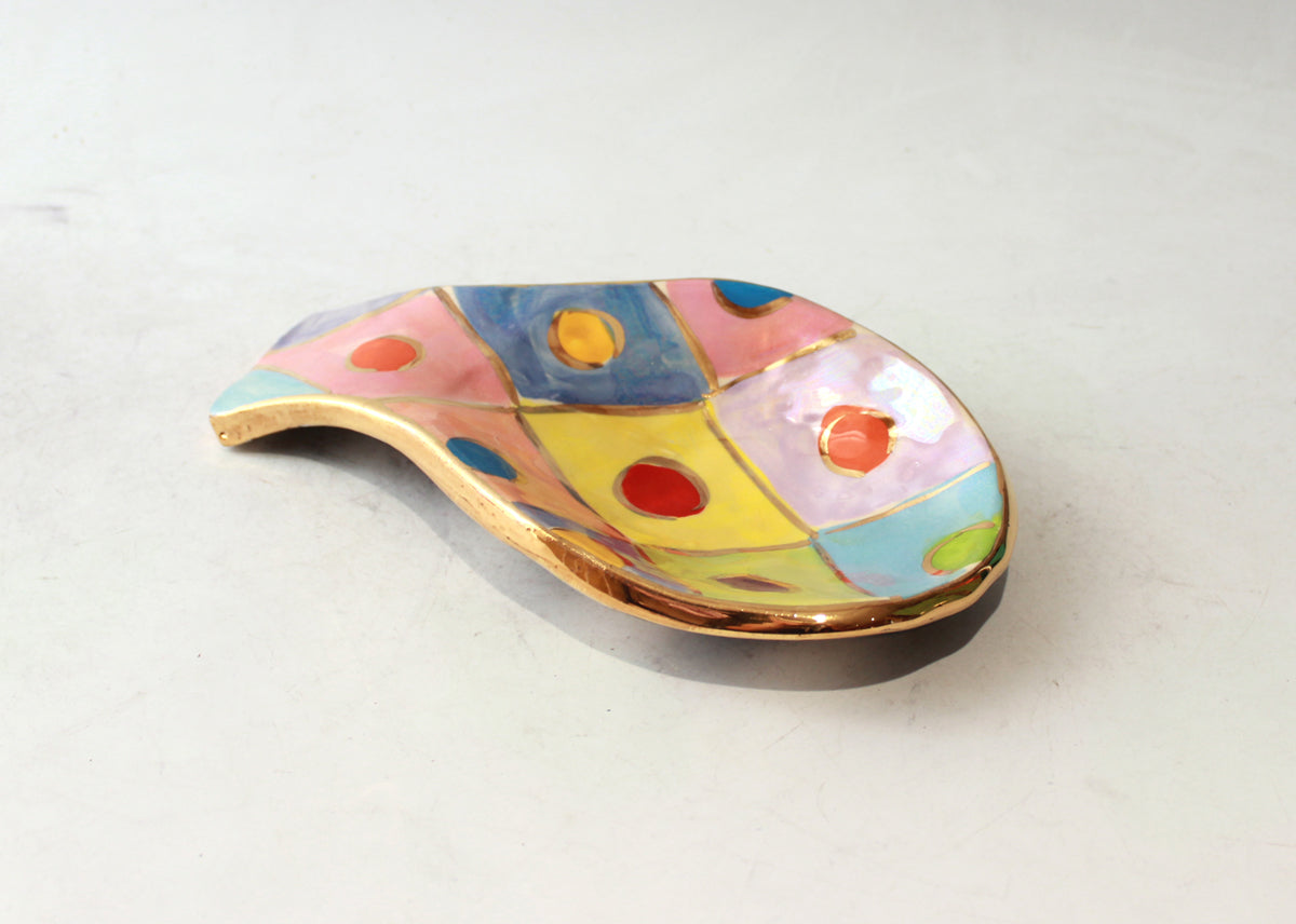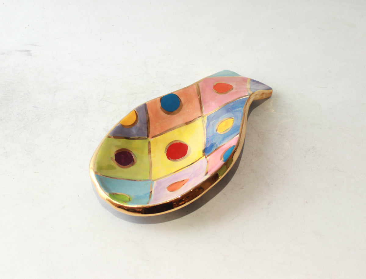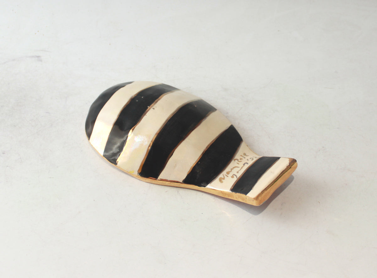 A Spoon Rest can be used as a safe place to put your dripping wooden spoon whilst cooking, it can house a teaspoon if your household are frequently making Tea and Coffee, or indeed it can simply look pretty on your Mantlepiece...this one is painted in "Diamonds" design, with accents of 24 carat gold throughout and covering its rim and a contrasting black and white striped base!