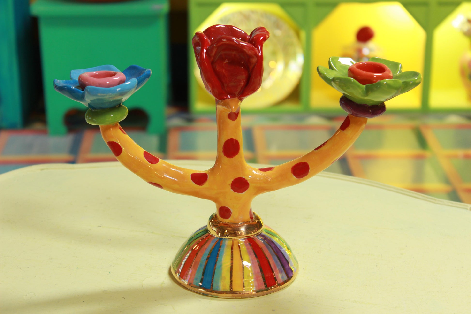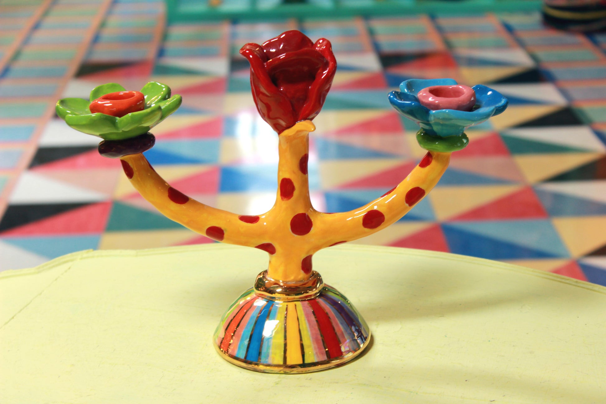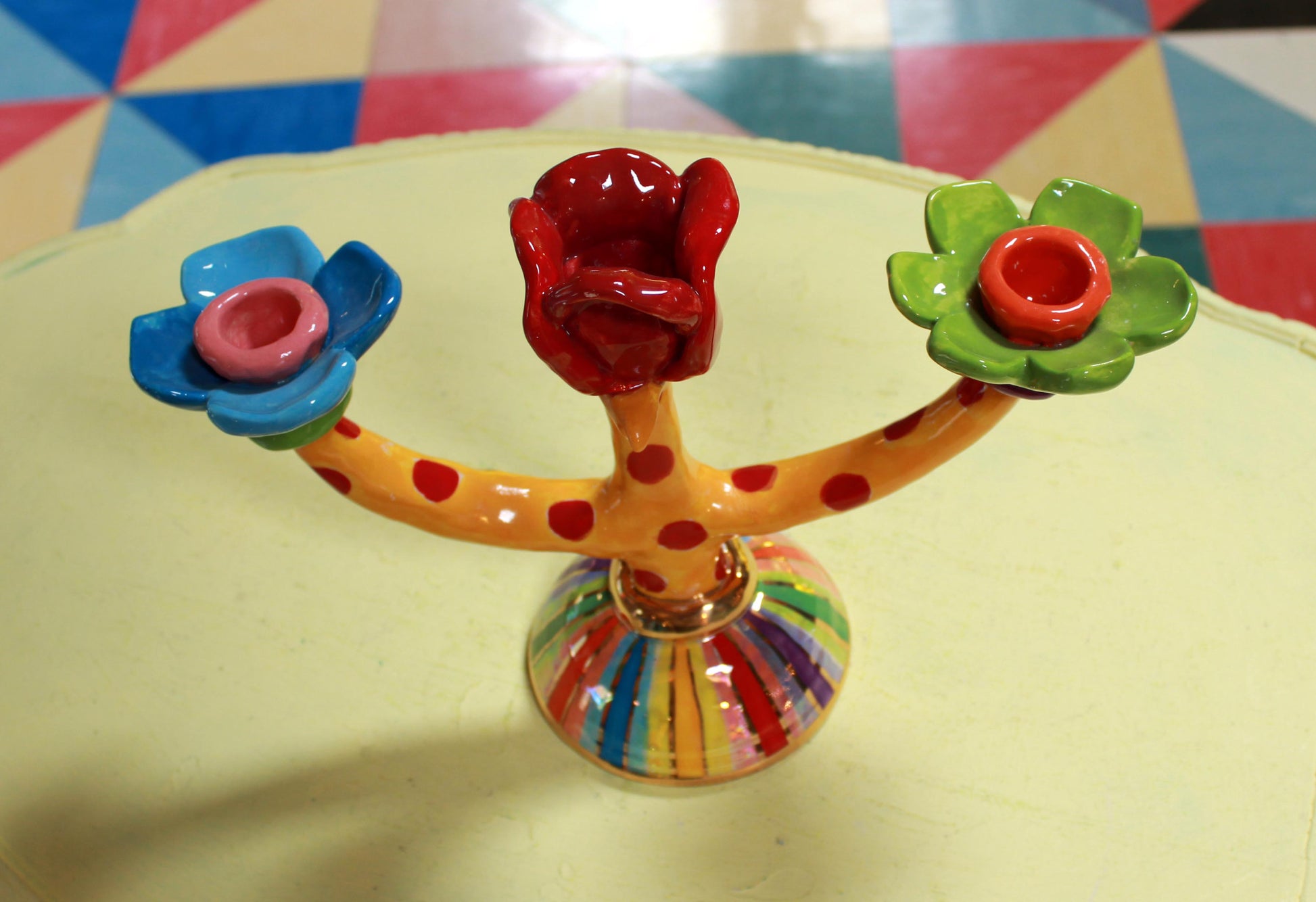 A handmade tour de force! The trick is to allow the stem to dry to exactly the right hardness to still be able to attach flowers and yet for it to have enough structural strength to stand up under their weight...the piece is 25cm high and candles will have to be stuck in with the aid of some blue-tack