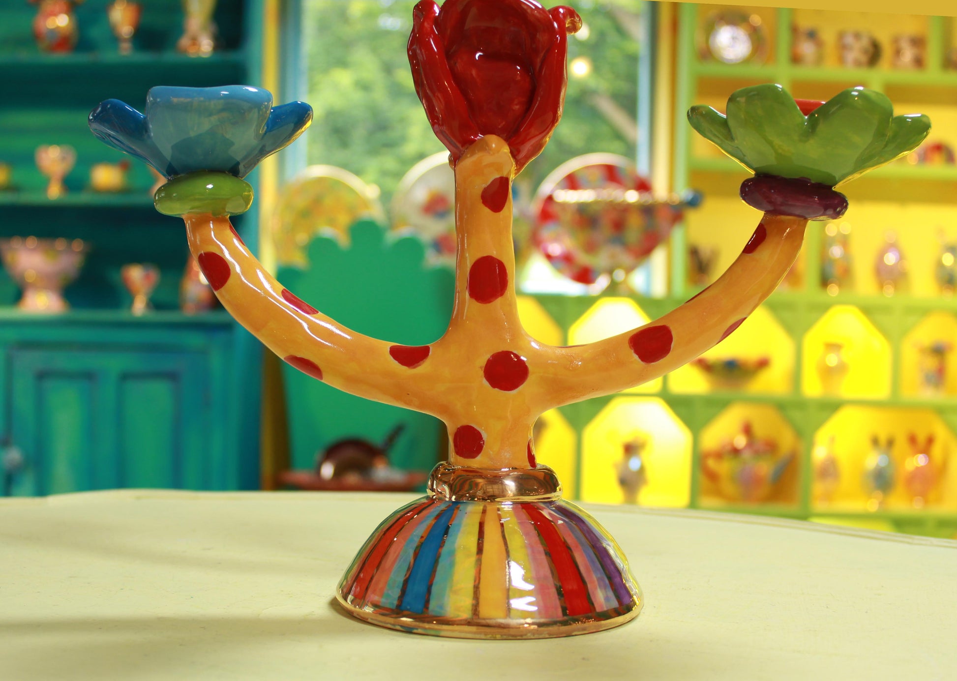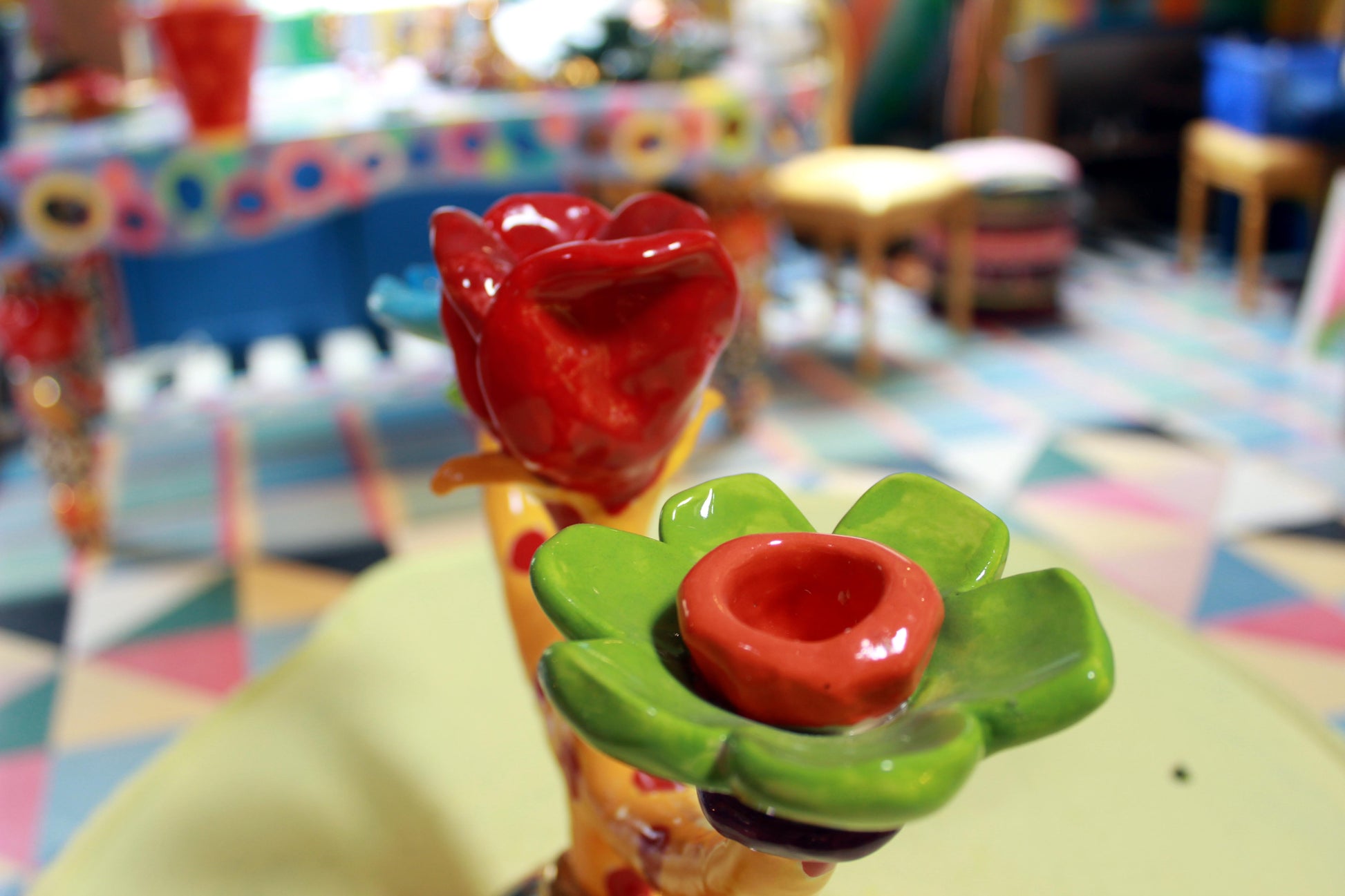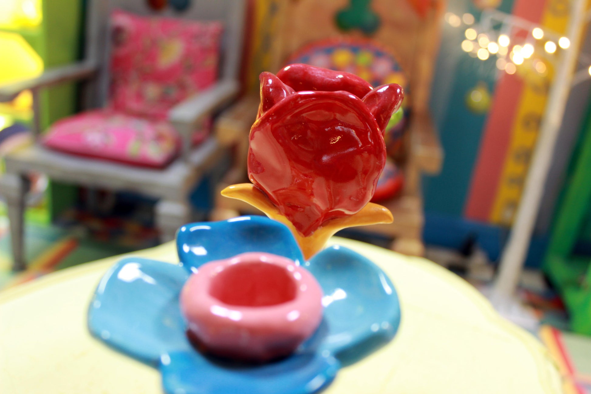 A handmade tour de force! The trick is to allow the stem to dry to exactly the right hardness to still be able to attach flowers and yet for it to have enough structural strength to stand up under their weight...the piece is 25cm high and candles will have to be stuck in with the aid of some blue-tack