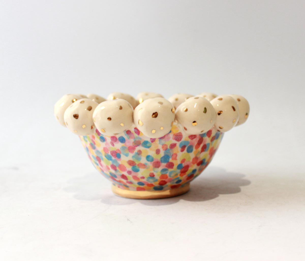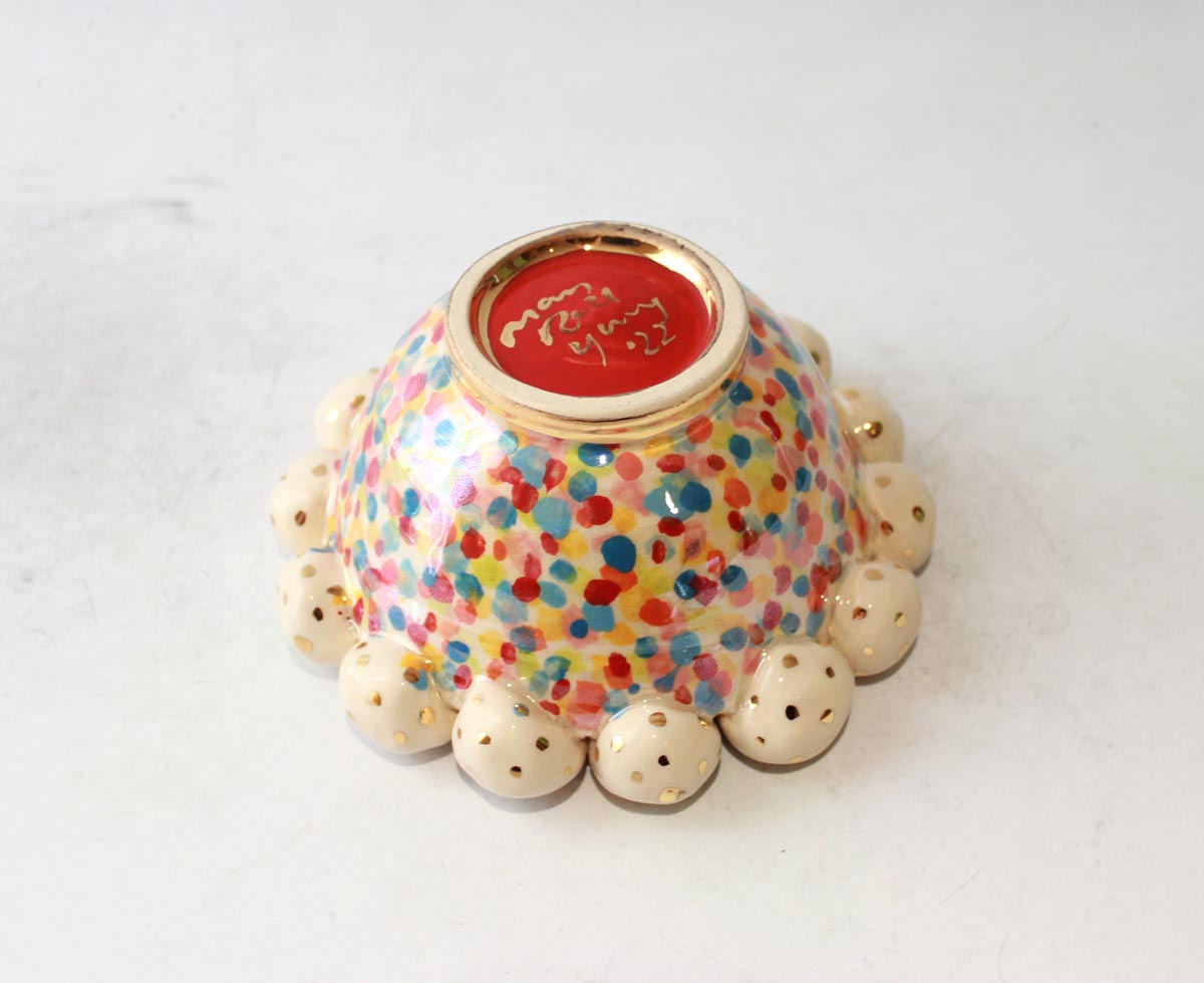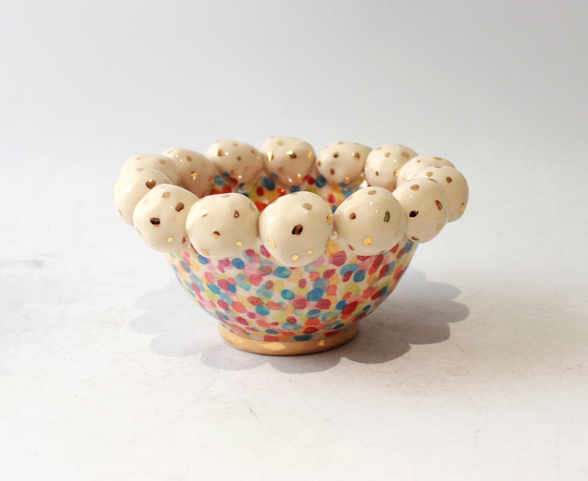 This rather stunning piece is a Tiny Bowl that has had ceramic beads "stuck on" its rim...the bowl is painted in "Confetti" design with a layer of iridescence, and the beads have been flecked with accents of 24 carat gold...the piece stands around 2.5 inches tall