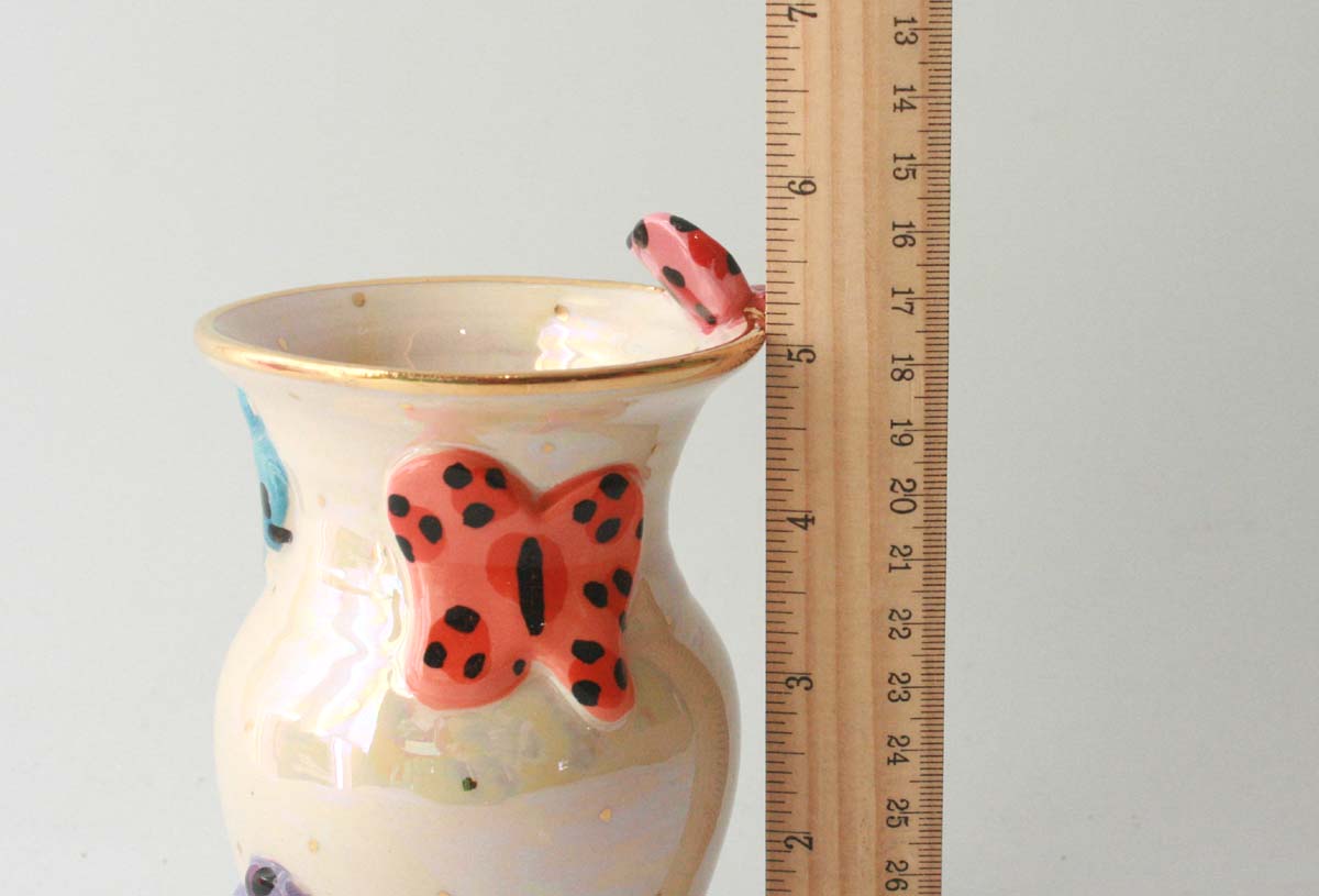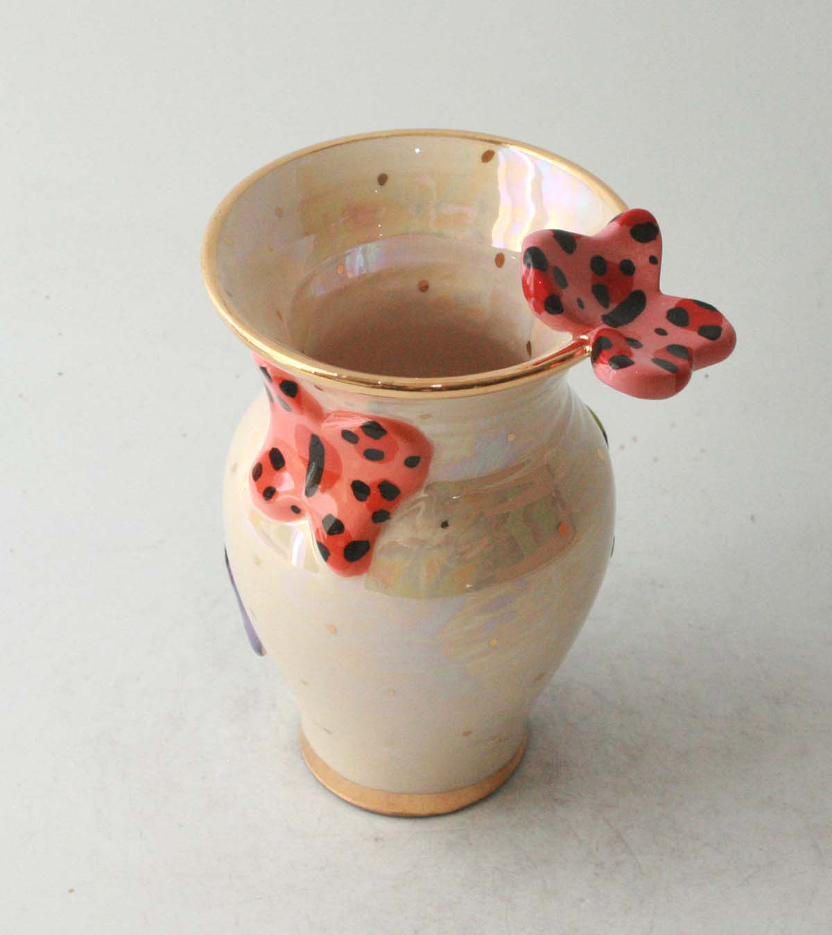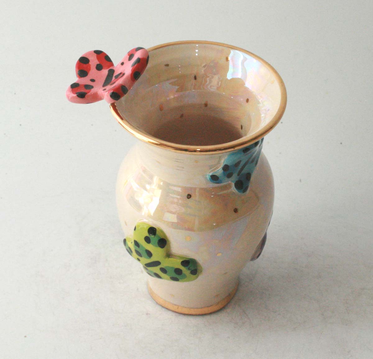 This Vase stands just over 5 inches tall, and it appears to have been invaded by Butterflies of different colours! They sit on a background of iridescent white with gold flecks, and the piece has a gold base and rim to match...