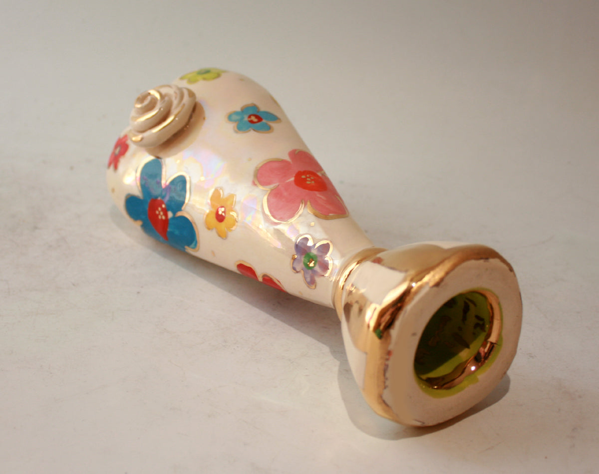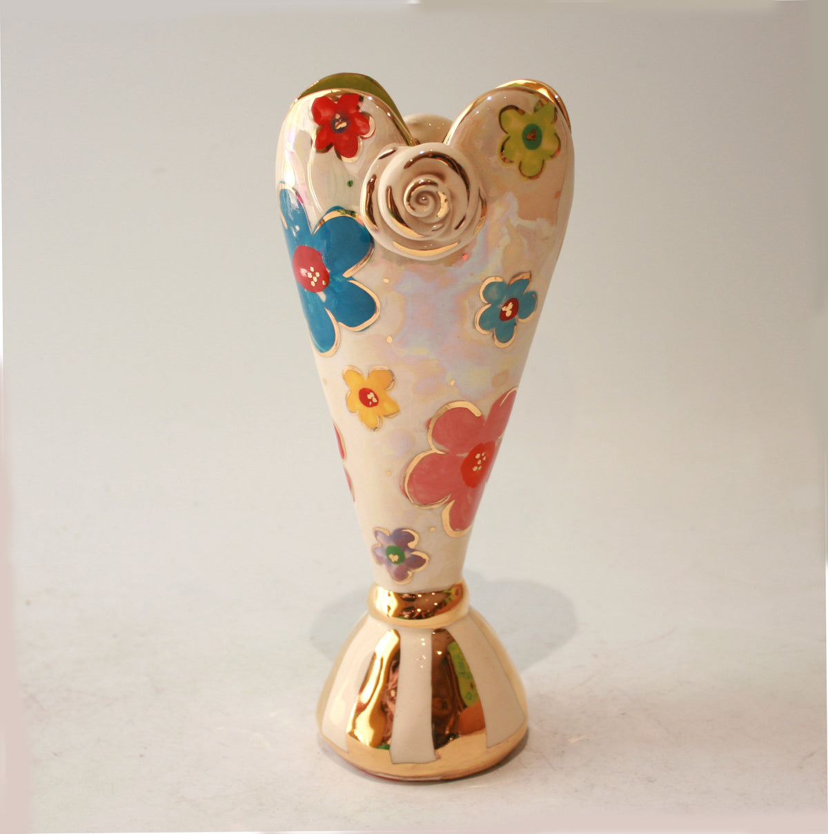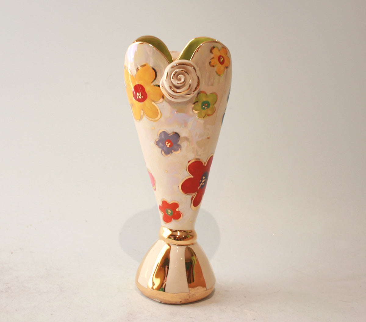 A Tiny Heart Vase made by Mary Rose stands about 9 inches tall and is full of all the whimsical charm that defines her work...this one is painted in "Daisy" on an iridescent white background with a gold and white striped base!