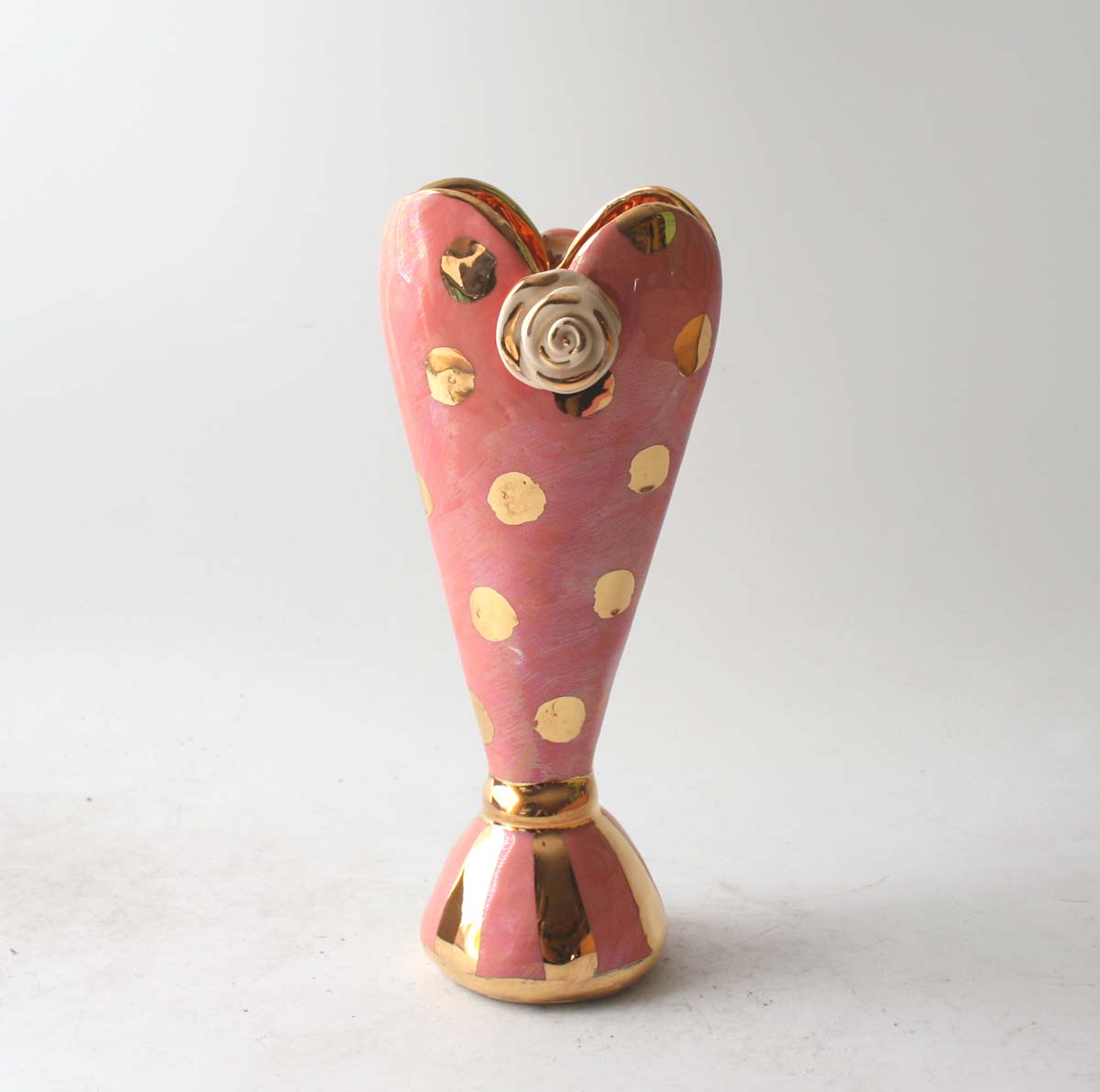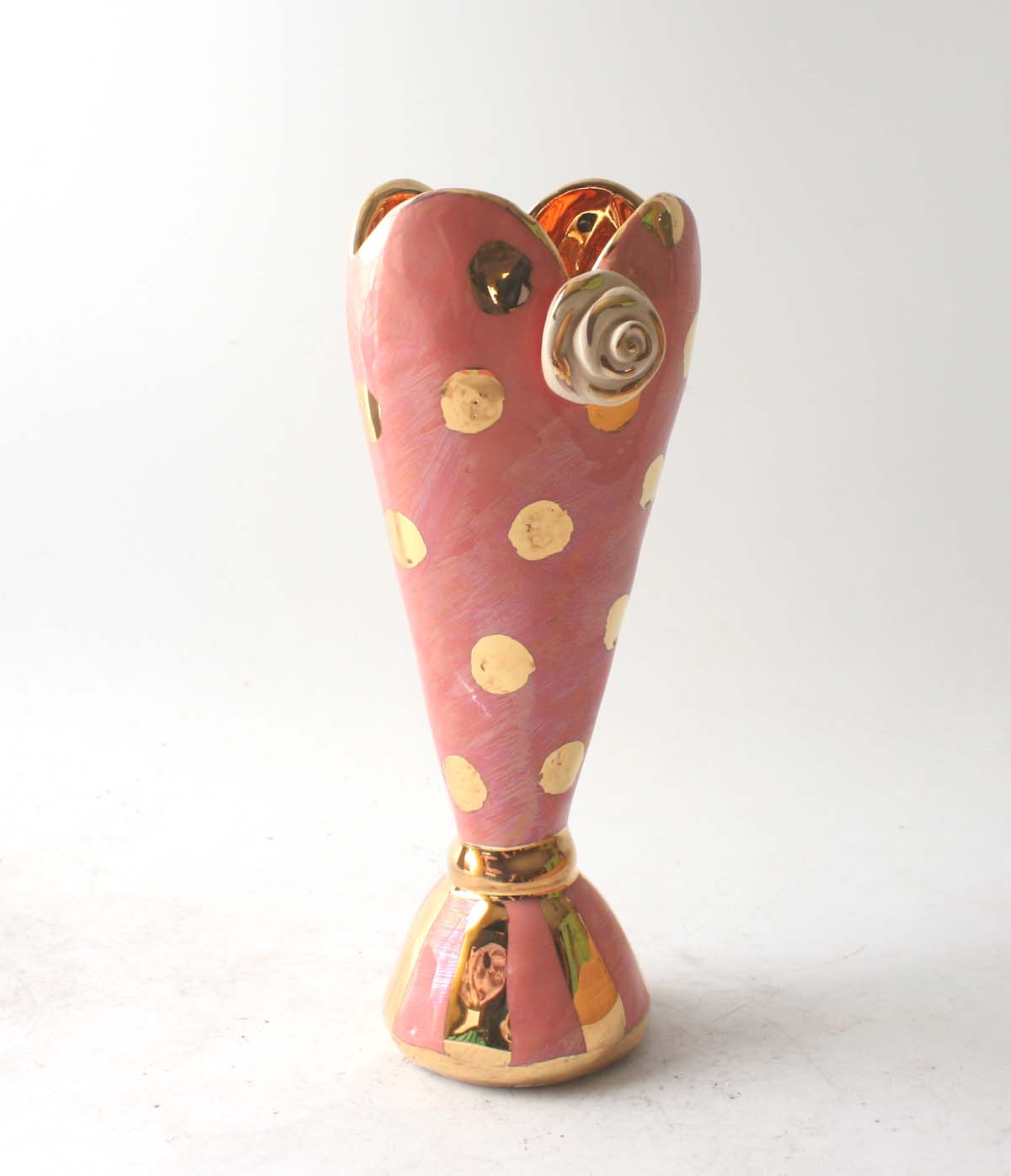 Mary Rose's Tiny Heart Vases stand around 9 inches tall, and are full of all of the whimsical charm that defines her art...this one is painted in a beautifully iridescent pink which is occupied by intricate gold dots! The base is gold and white striped to match the all-gold inside, and the little ceramic rose in its centre ties the whole piece together wonderfully...