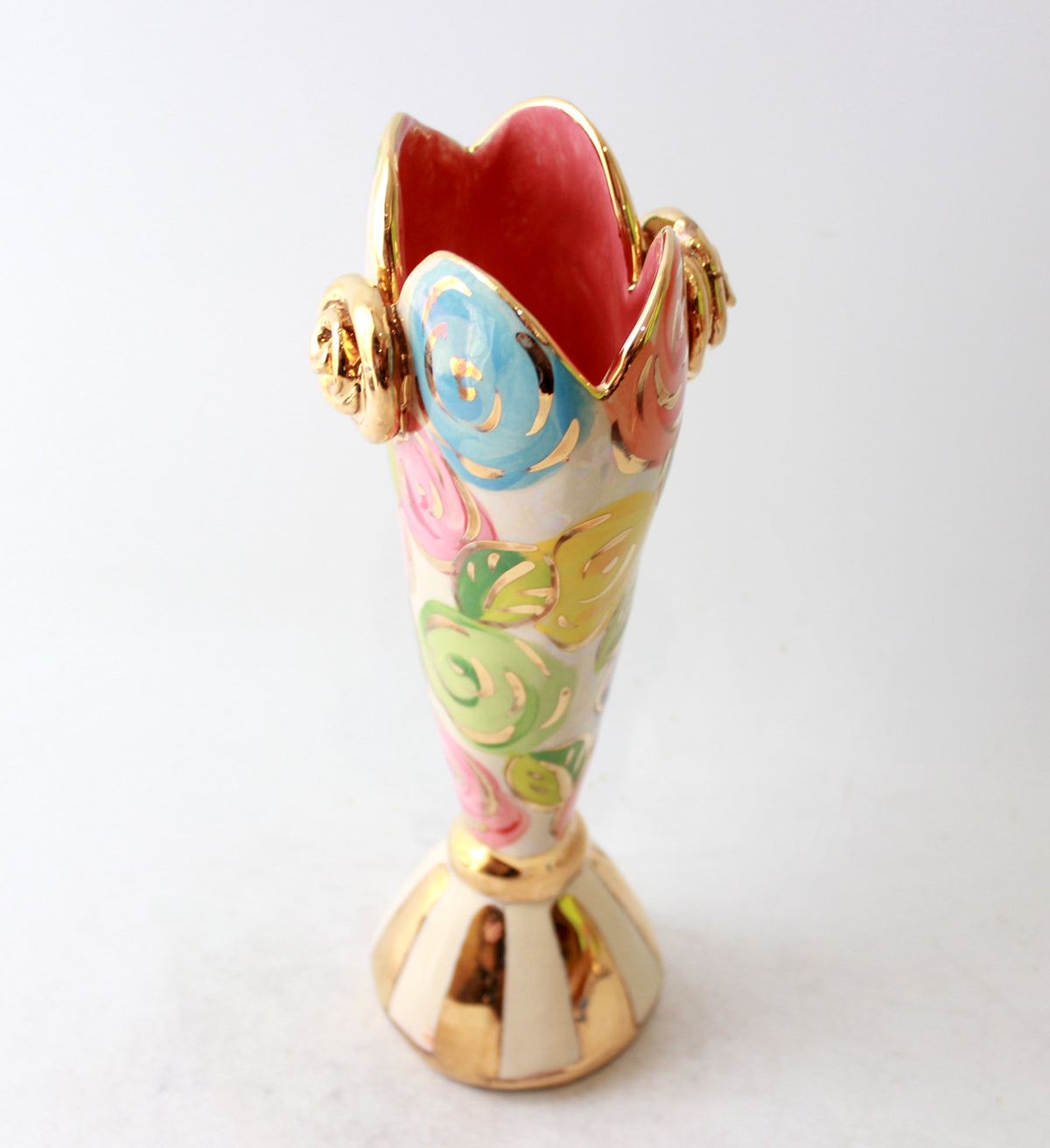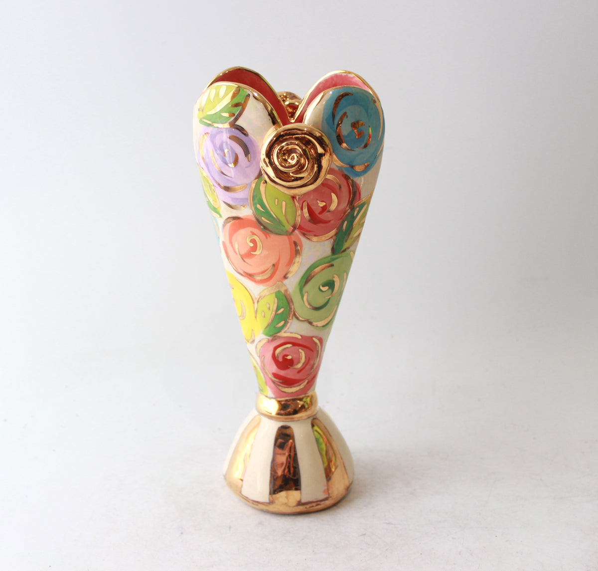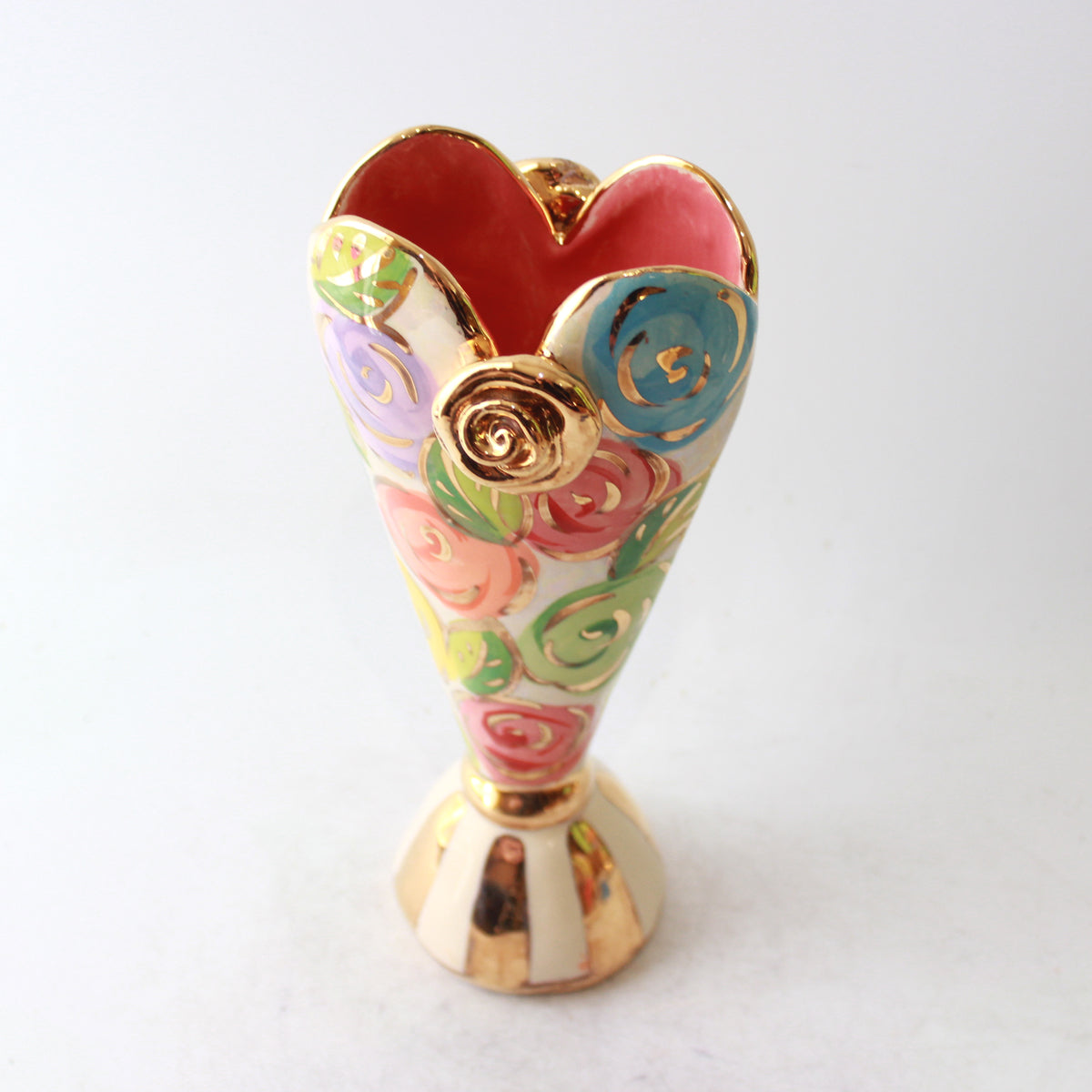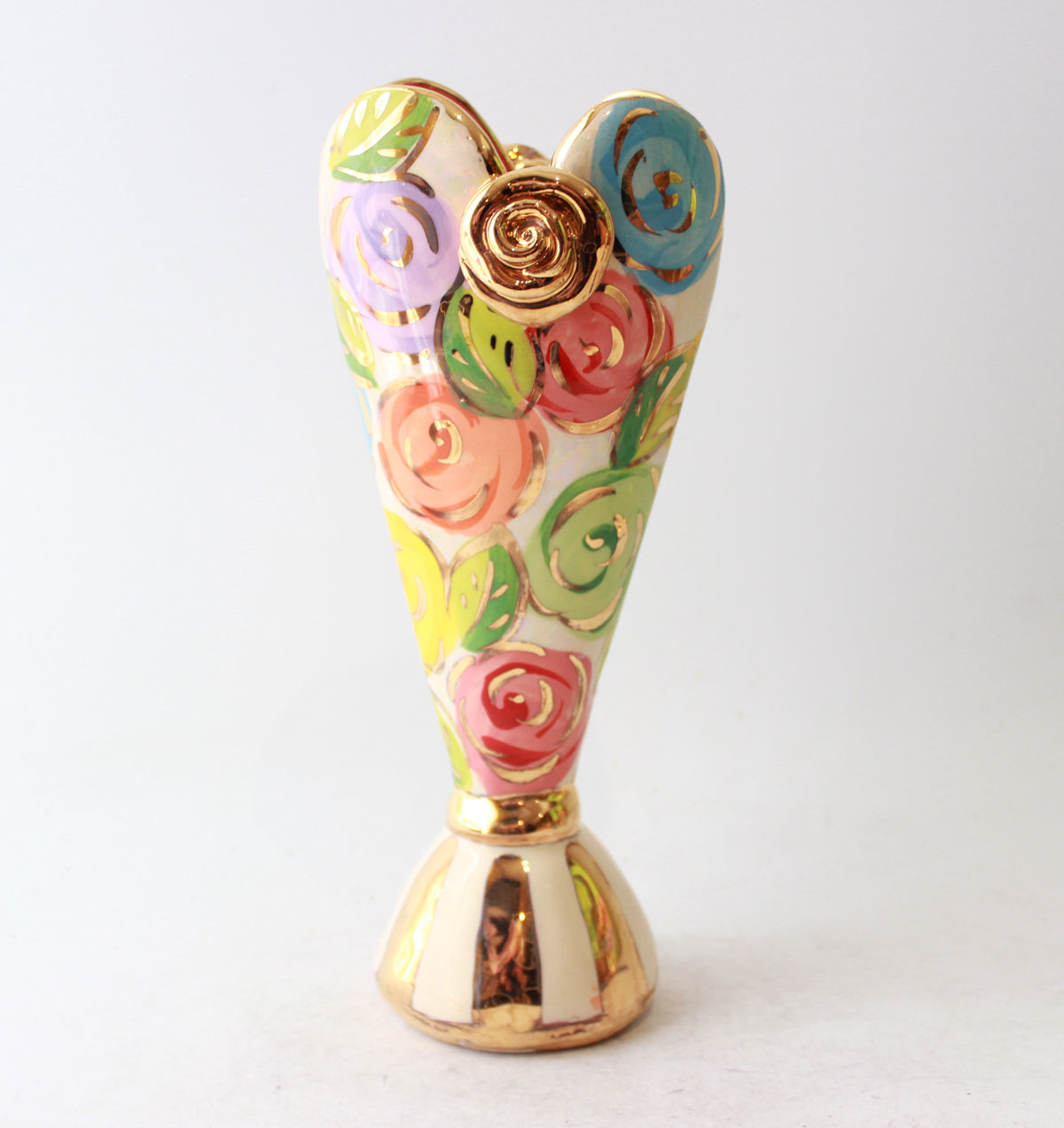 A Tiny Heart Vase made by Mary Rose stands around 9 inches tall and is full of the whimsical charm that defines her work...this one showcase one of her newest designs, "Pastel Block Rose", featuring colourful roses on a background of iridescence with accents of 24 carat gold!