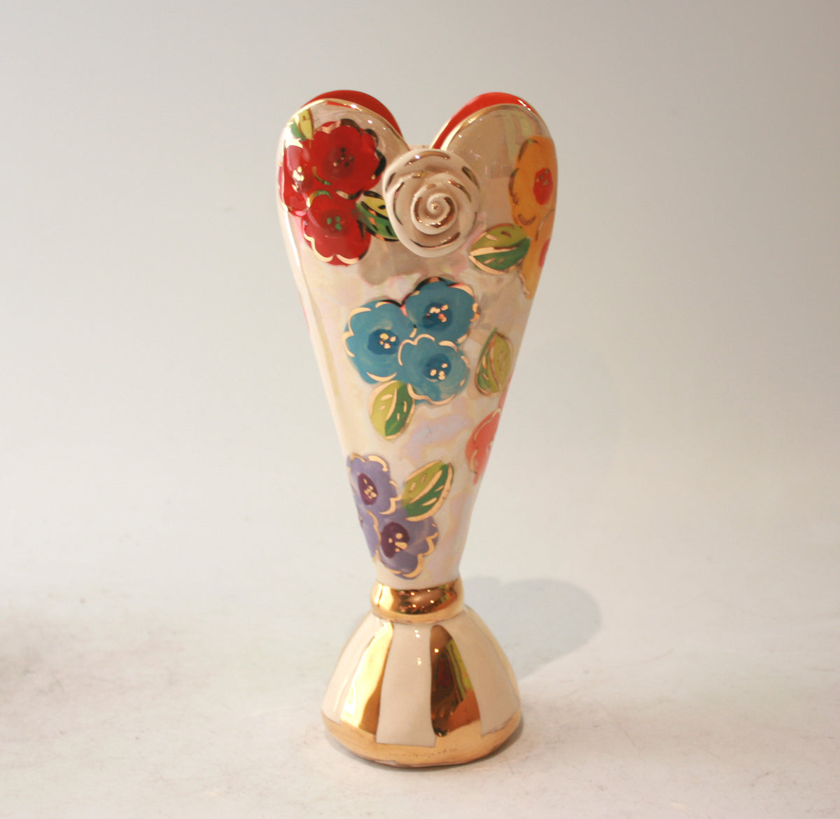 A Tiny Heart Vase made by Mary Rose stands about 9 inches tall and is full of all the whimsical charm that defines her pieces...this one is painted in "Petit Fleur" on an iridescent white background with a gold and white striped base!