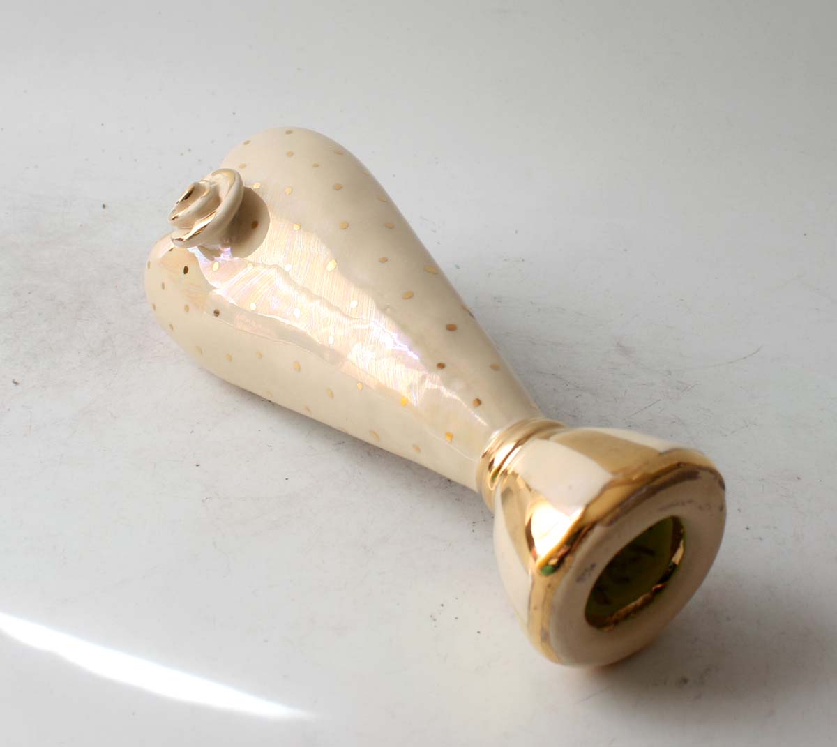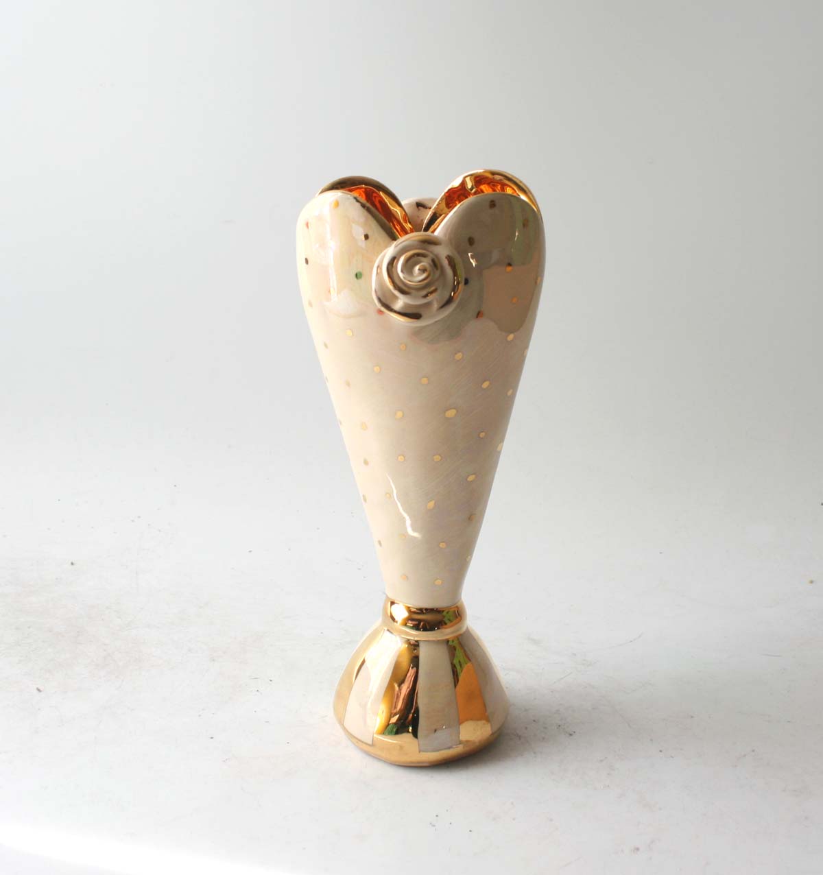 A Tiny Heart Vase made by Mary Rose stands around 9 inches tall and is full of all of the whimsical charm that defines her art...this one has been lovingly painted first with a layer of iridescence upon which gold flecks sit comfortably...the base is gold and white stripes and the inside, surprisingly, is gold all over!