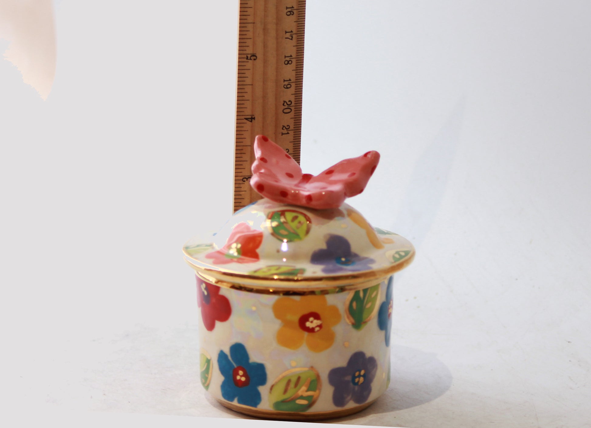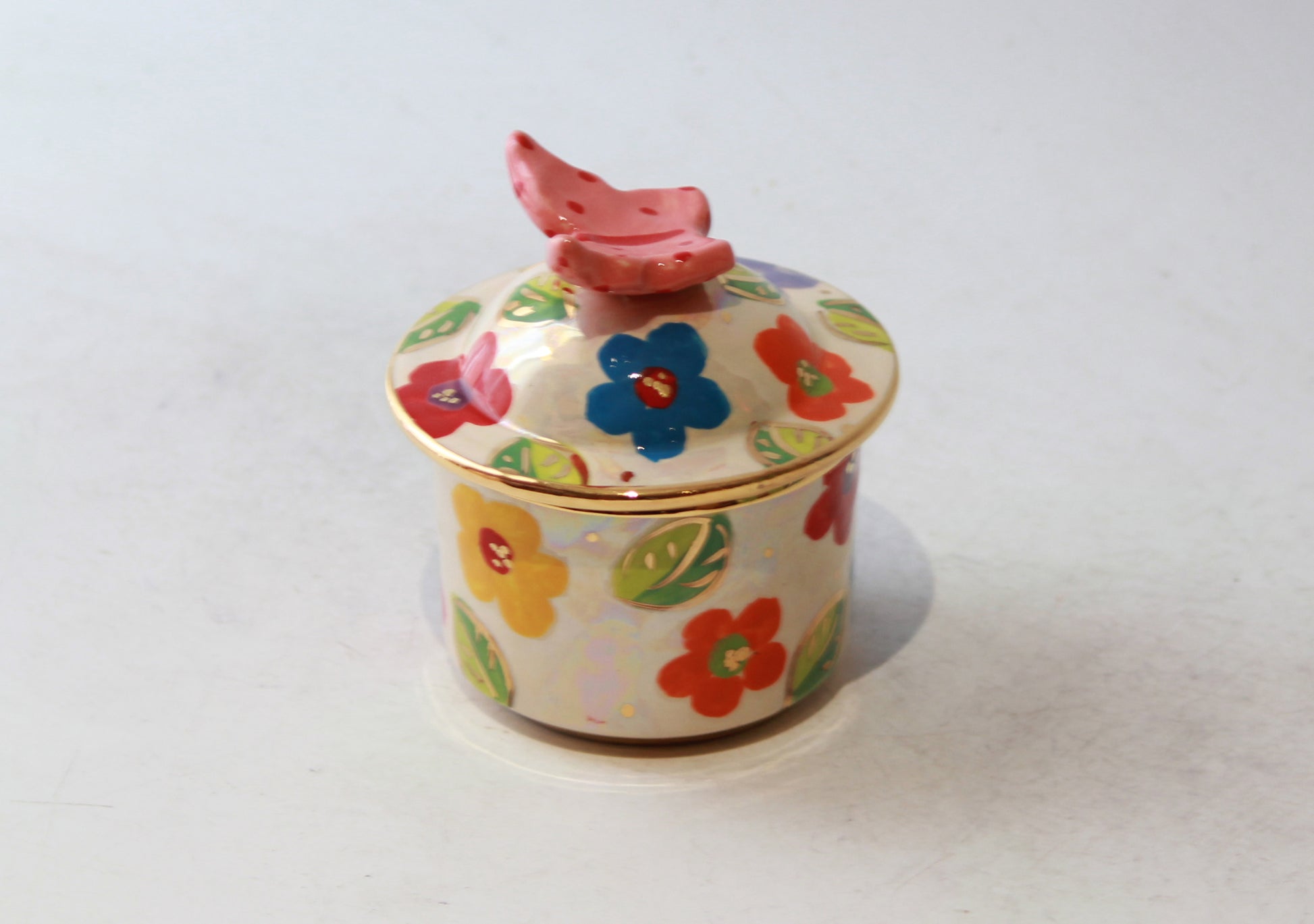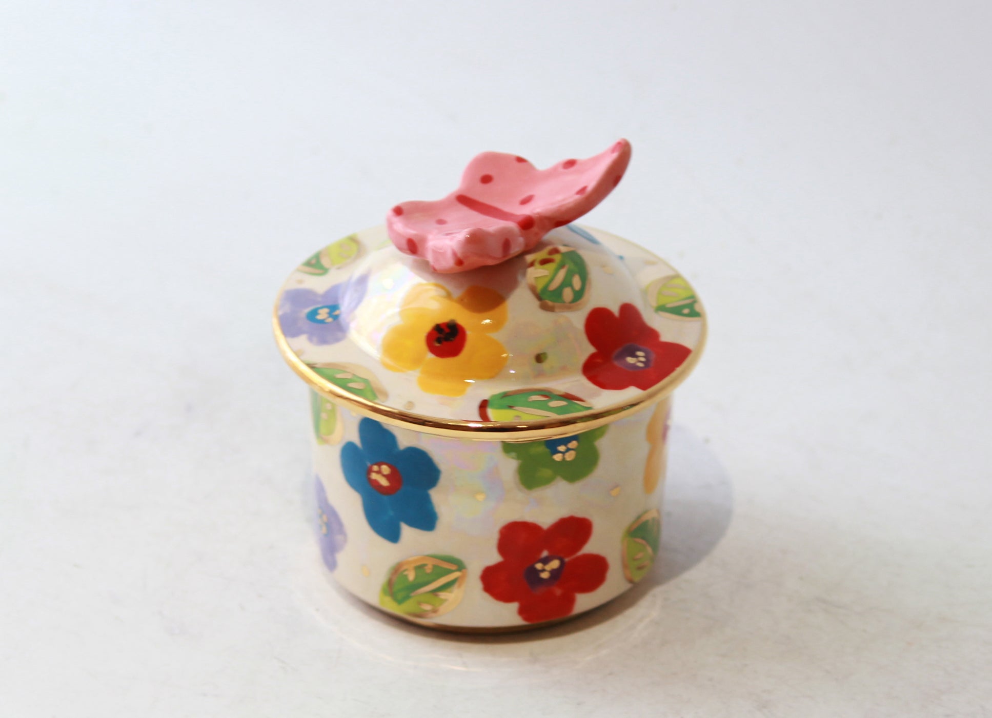 A tiny lidded pot that has a lot of decorative features! Multicolour Daisy Design is painted all over and, just like may happen a summer's day, a butterfly has landed on top and been frozen there forevermore.