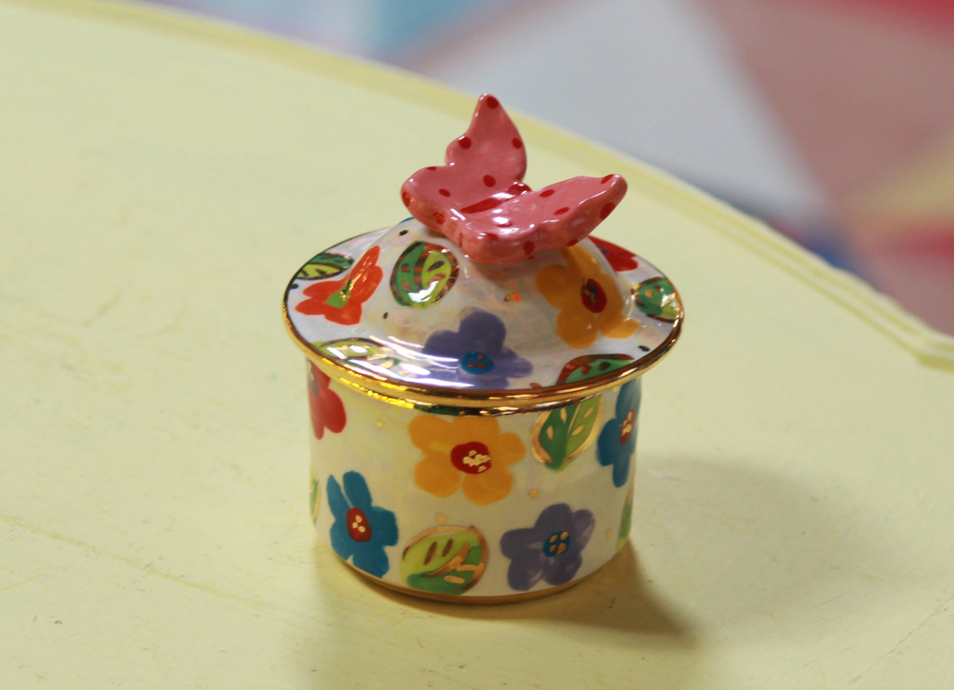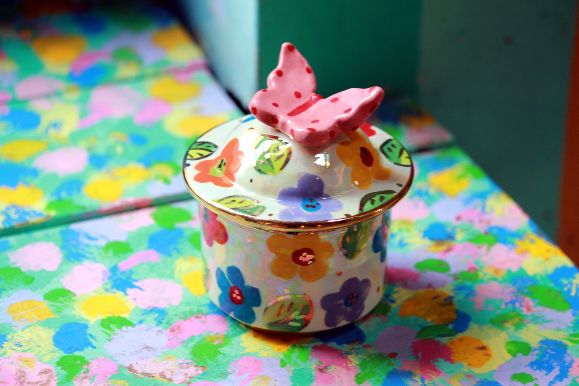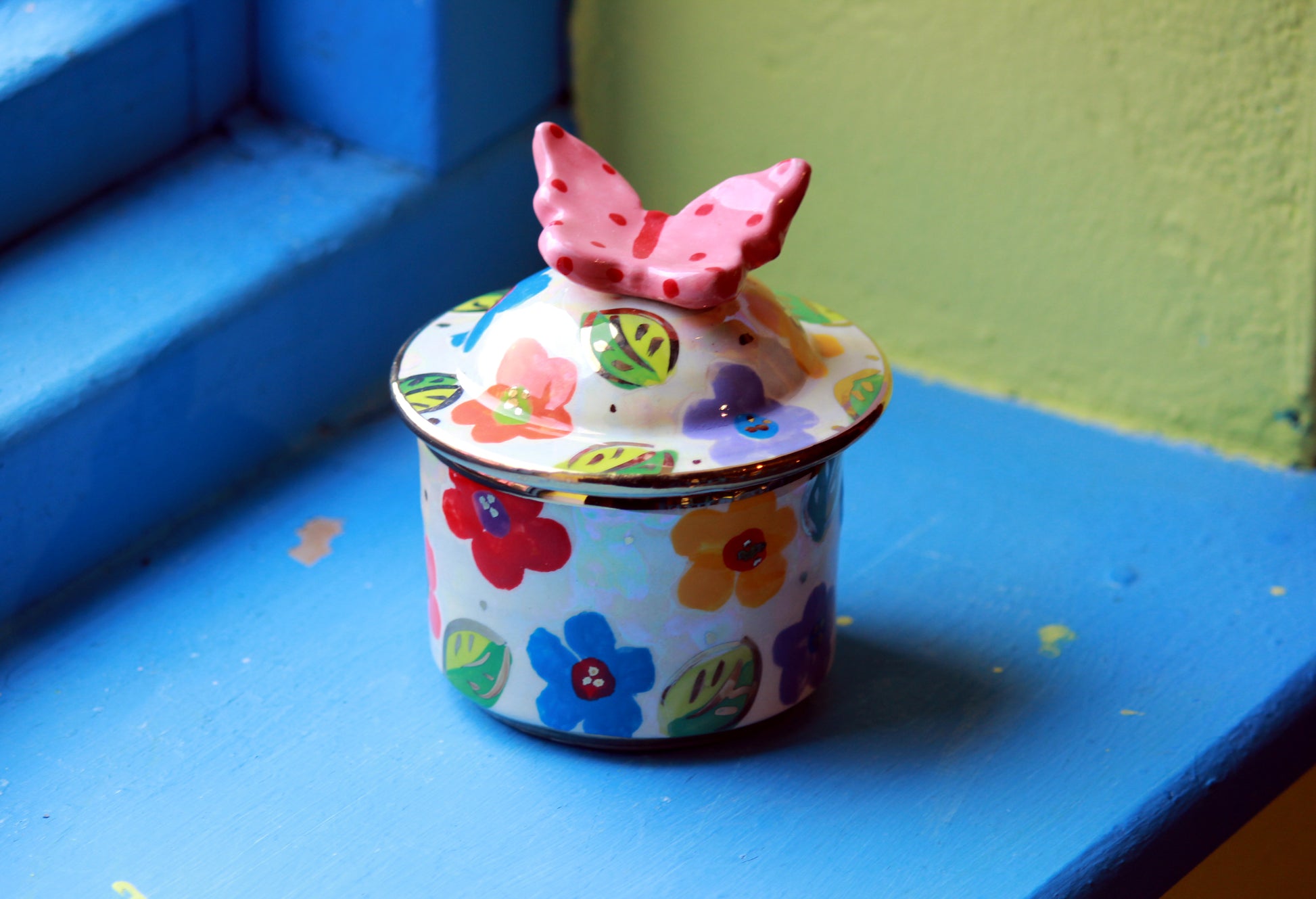 A tiny lidded pot that has a lot of decorative features! Multicolour Daisy Design is painted all over and, just like may happen a summer's day, a butterfly has landed on top and been frozen there forevermore.