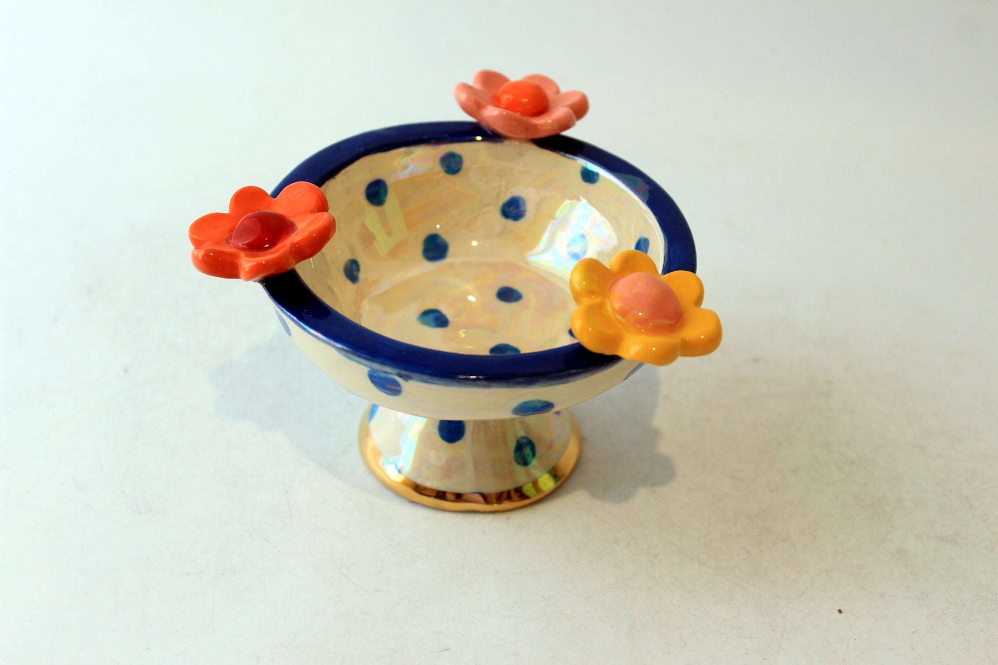 An elegant little bowl with a wide shape to allow for precious things to be stored and displayed. It sits on a raised plinth and has a wide rim allowing a decorative foil to all the other surfaces