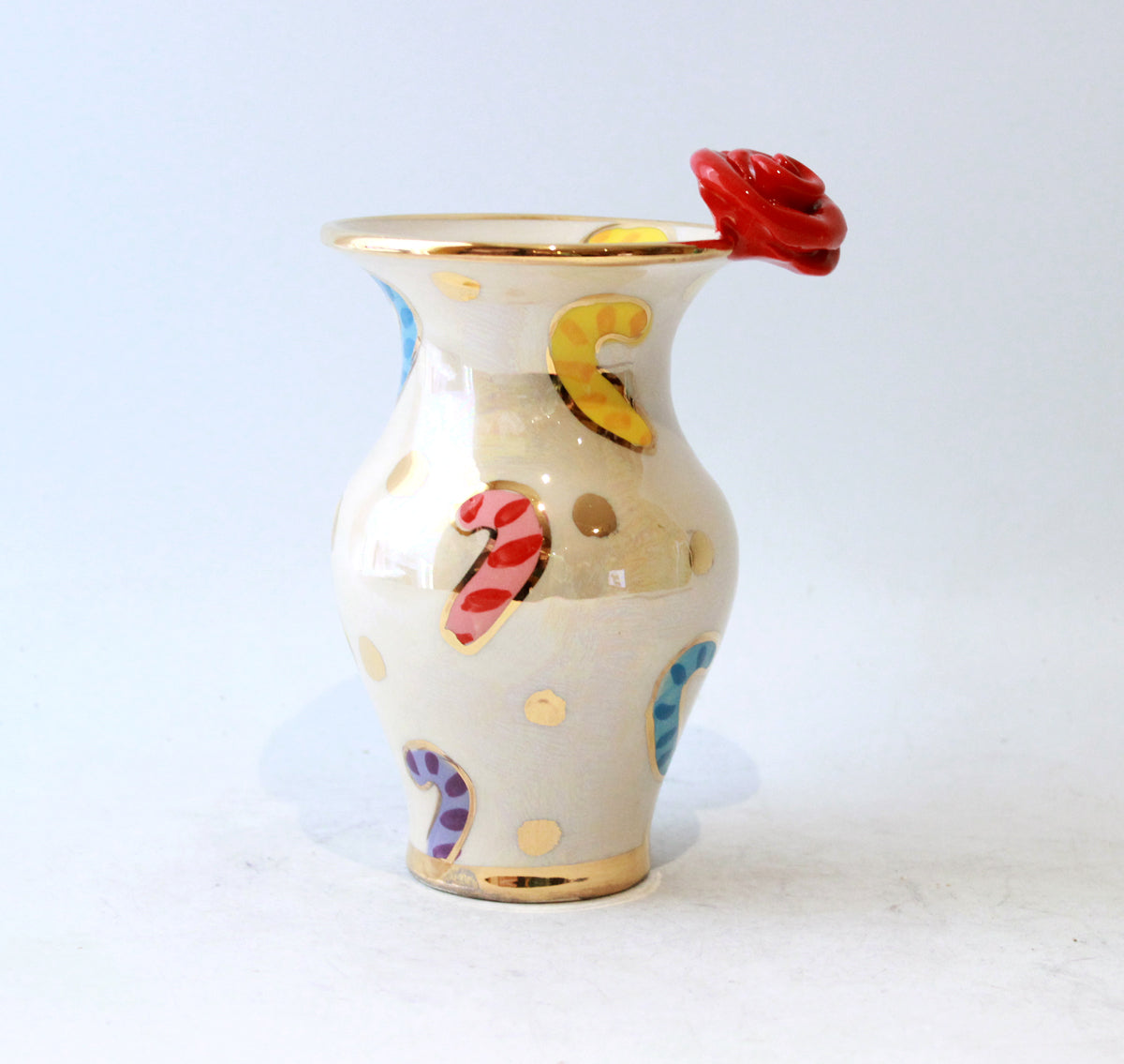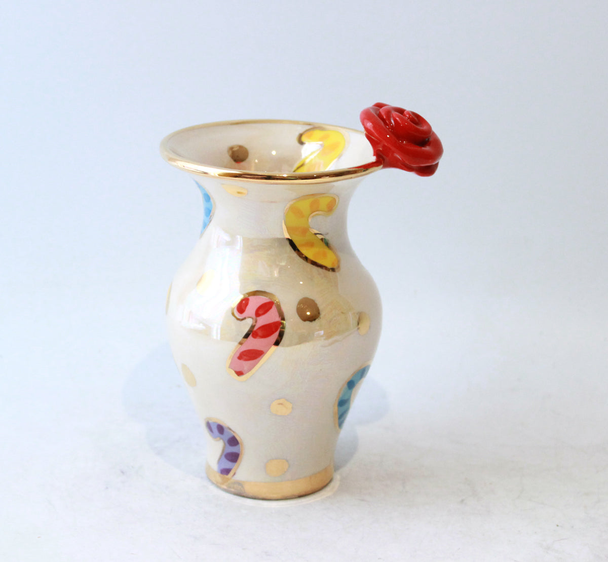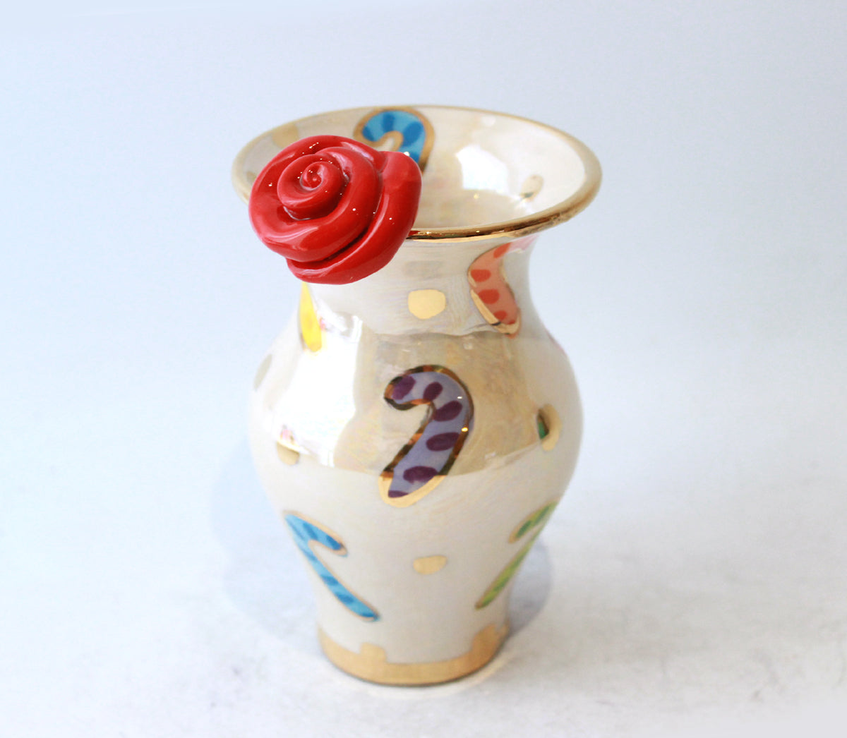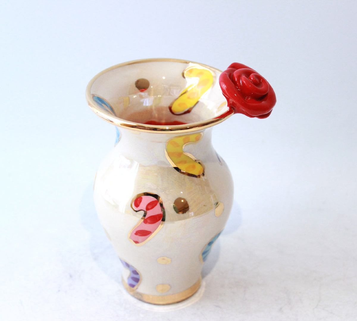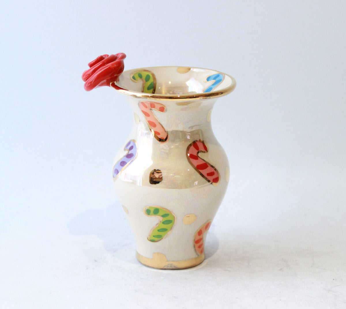 Mary Rose's Tiny Vases stand only around 5 inches in height, but are full of all of the whimsical charm which defines her work! This one is looking rather festive, painted in "Candy Canes" on an iridescent background with a bright red ceramic rose adorning its rim and accents of 24-carat gold throughout...