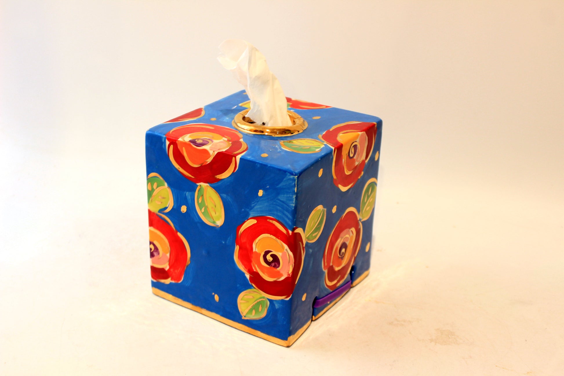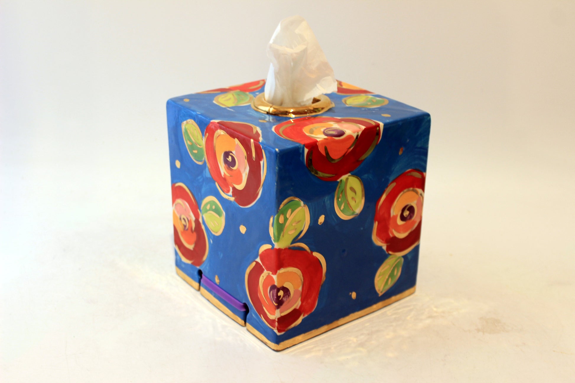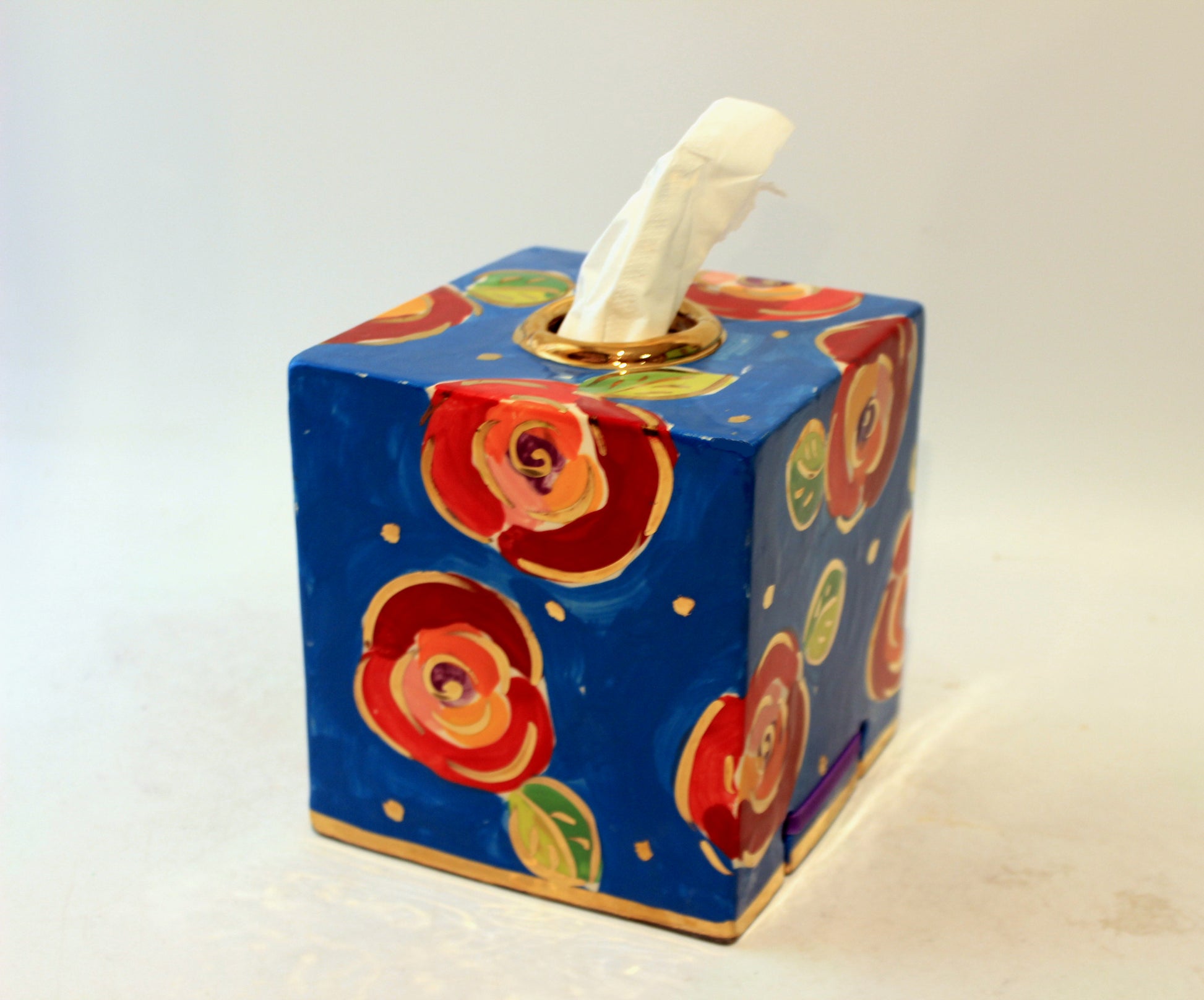 Mary Rose's Tissue Box is a cover closed on 5 sides and open at the bottom. A square cardboard box of tissues fits in neatly and can be secured with the supplied rubber band. The top is finished in gold and the effect is stunning.