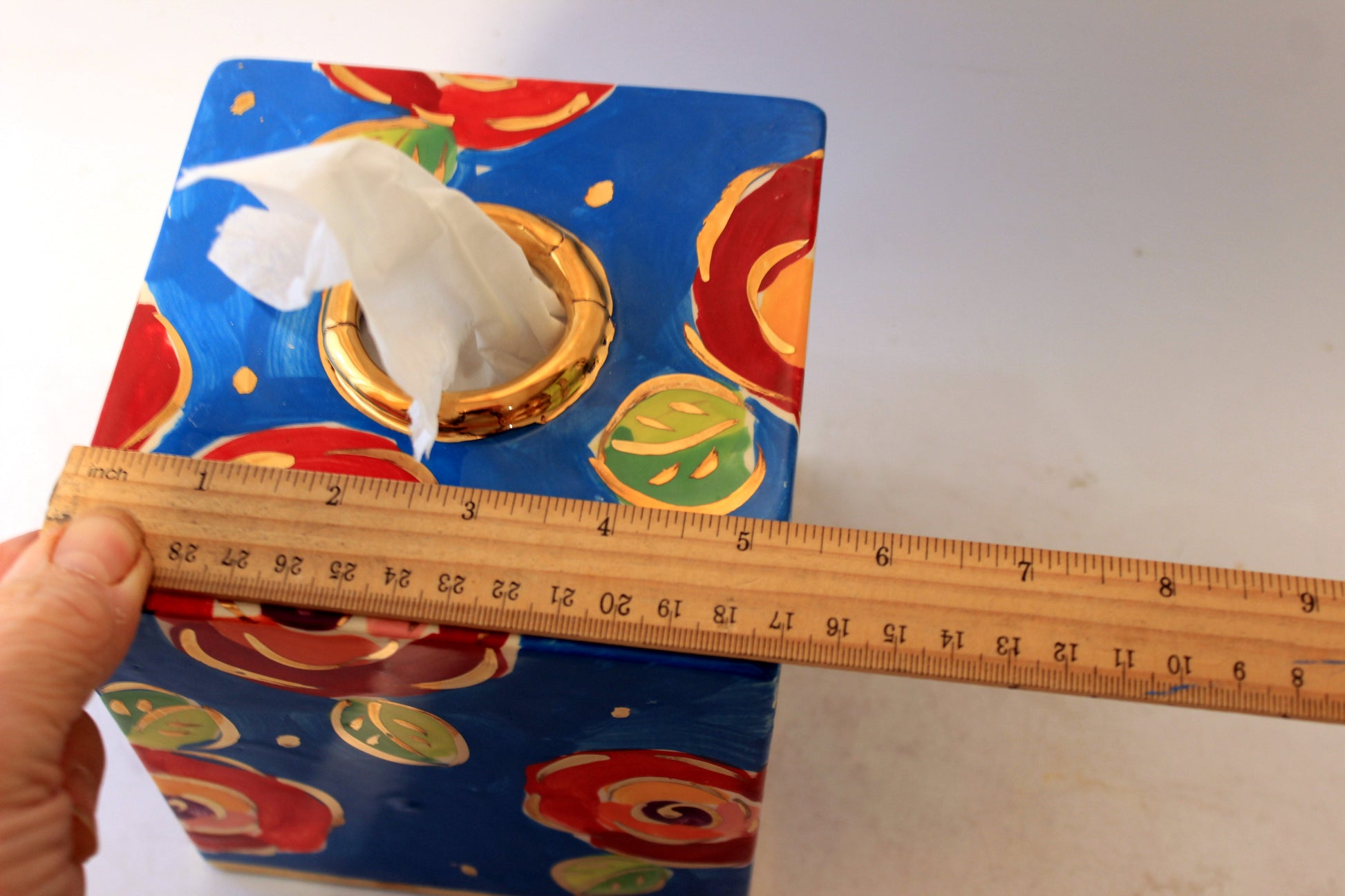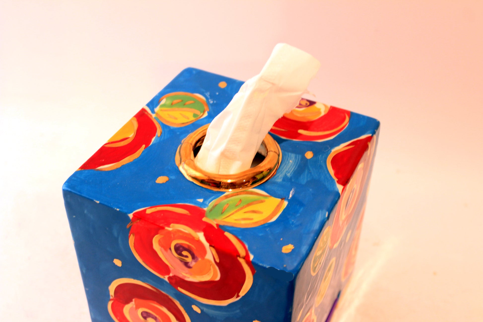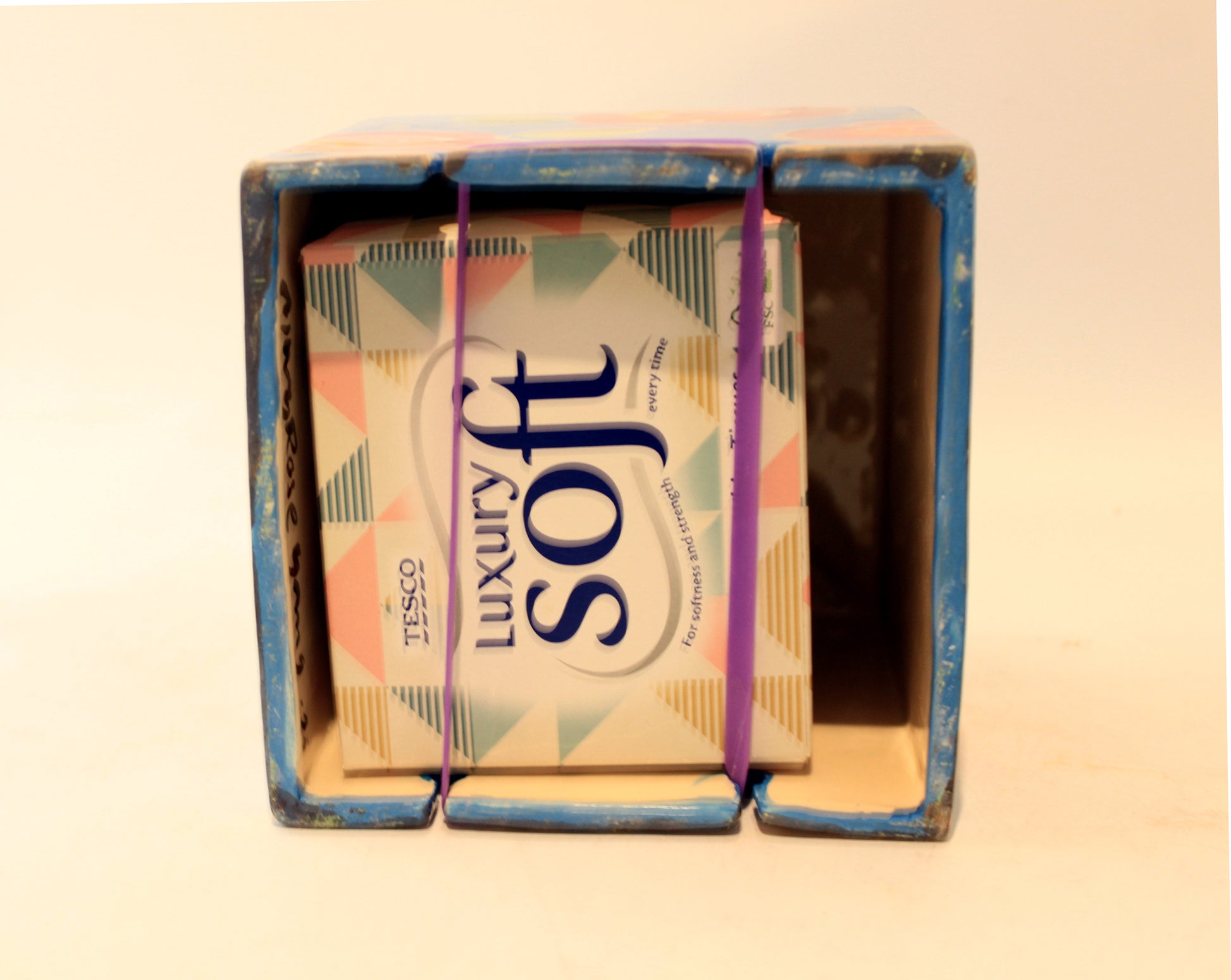 Mary Rose's Tissue Box is a cover closed on 5 sides and open at the bottom. A square cardboard box of tissues fits in neatly and can be secured with the supplied rubber band. The top is finished in gold and the effect is stunning.